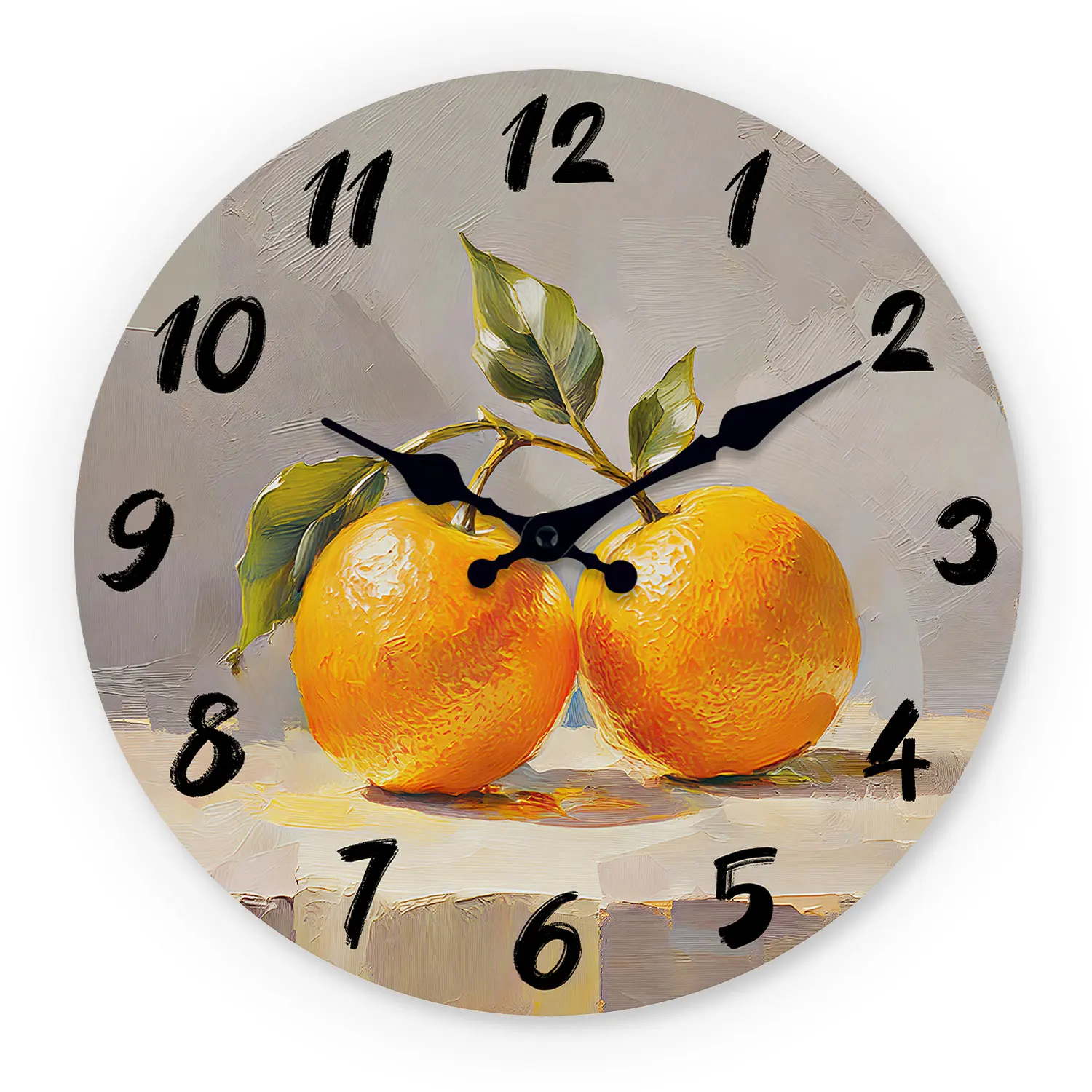 Oil Painting Style Wooden Wall Clock with Double Orange and Green Leaves, 10-16inch Silent Wall Cloc...