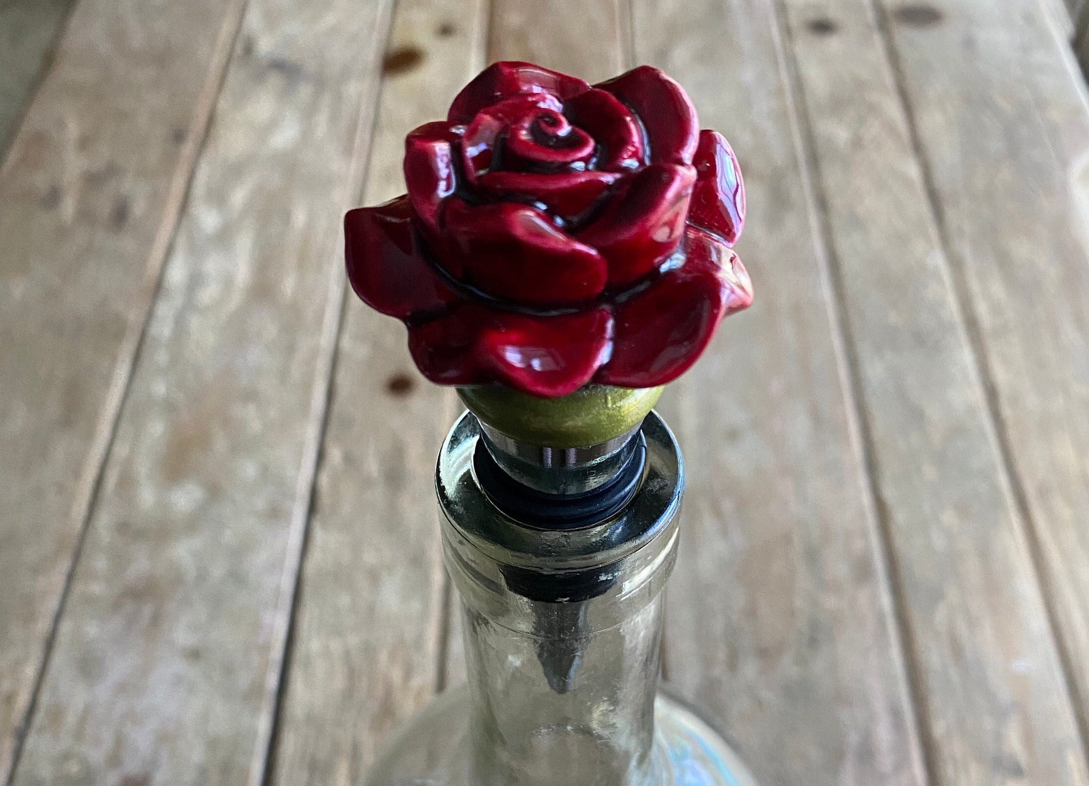 "The Baby Red Rose Bottle Stopper adds a delicate touch to any opened bottle of wine or spirits...