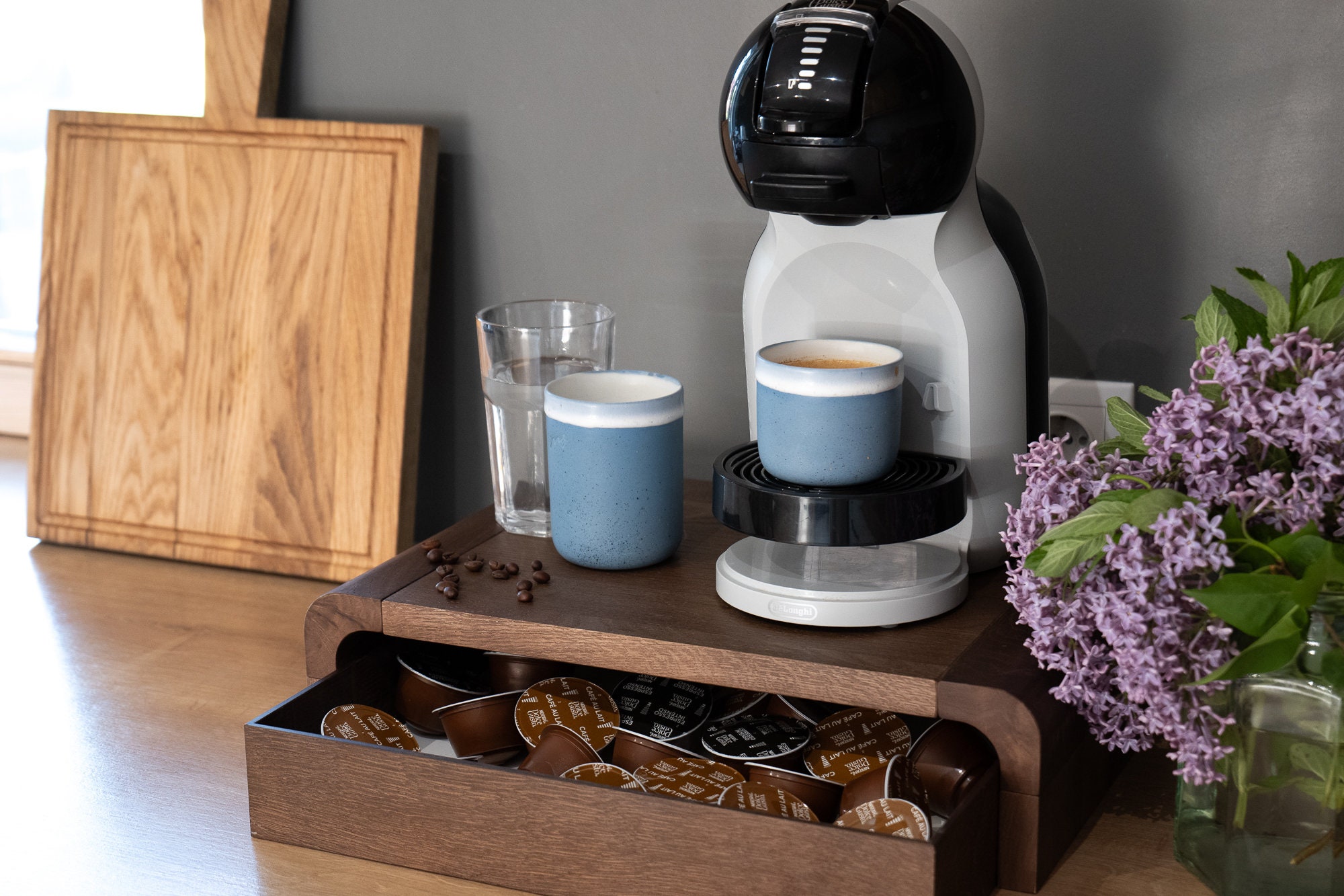 Oak wood Walnut color Coffee Capsule Holder: Solid Oak Coffee Machi...