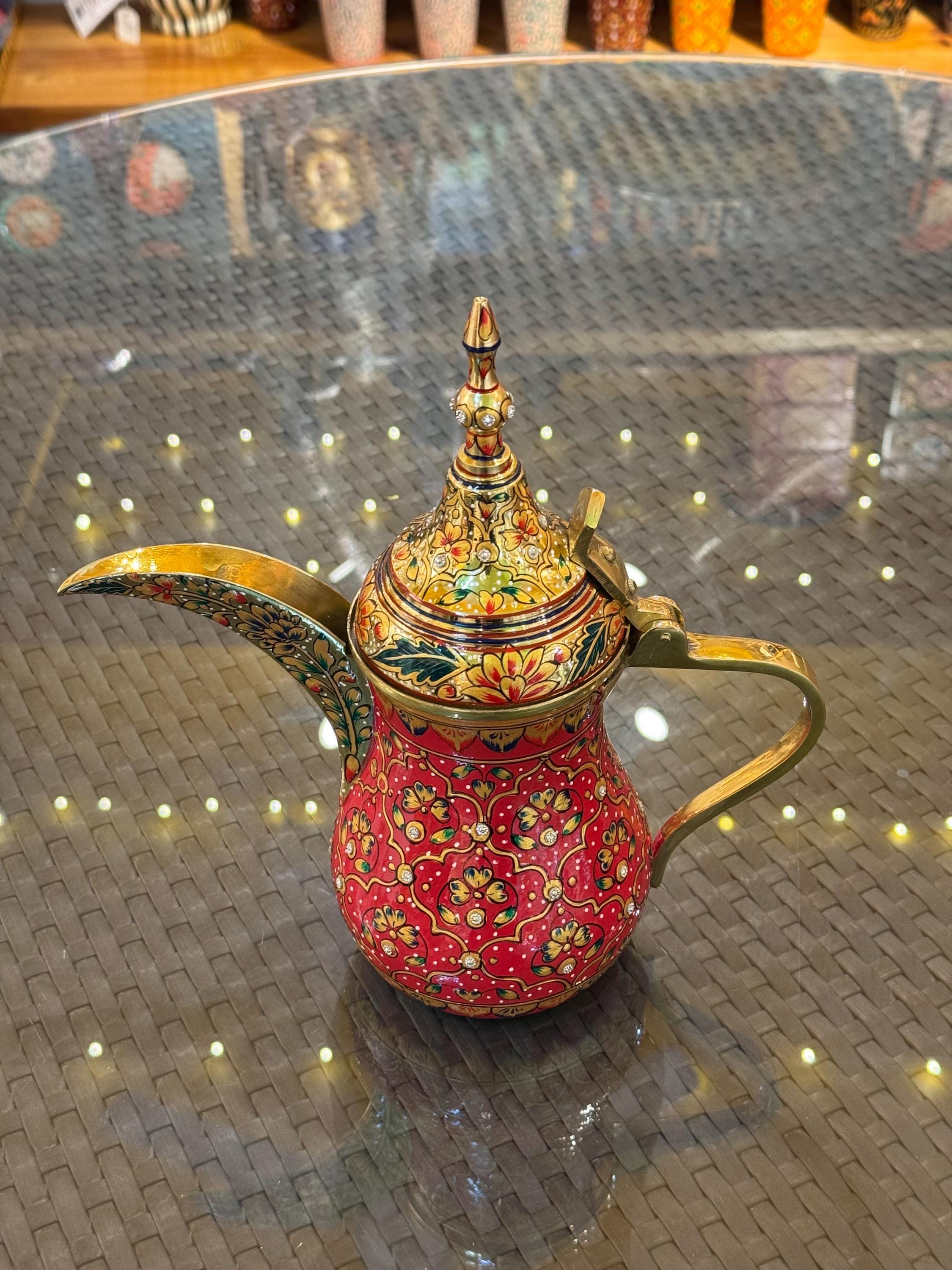 "This royal Arabic brass coffee pot from Kaushalam collection is hand painted in beautiful and ...