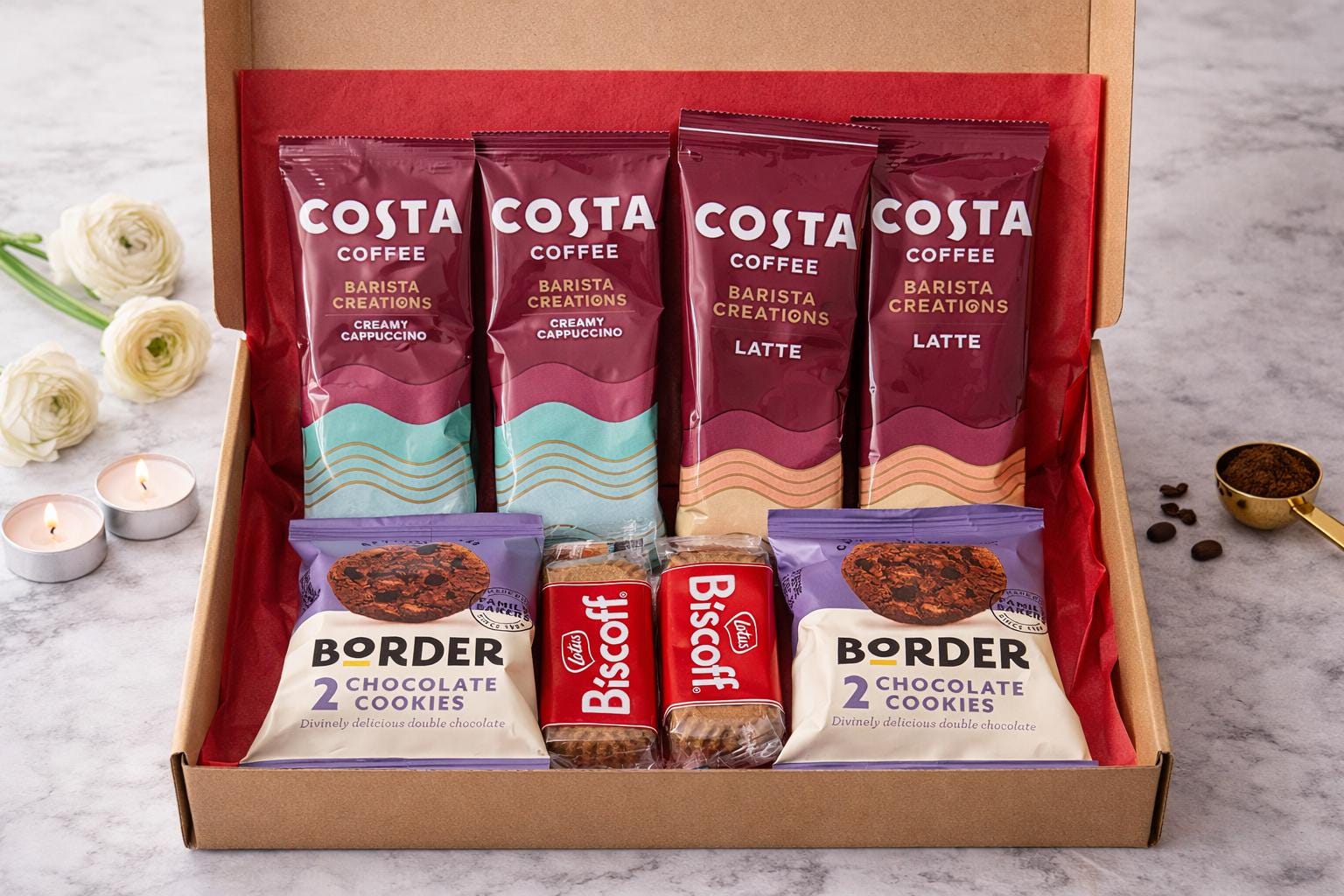 "Costa Coffee Gift Box is a cosy letterbox treat filled with coffee sachets, Lotus Biscoff bisc...