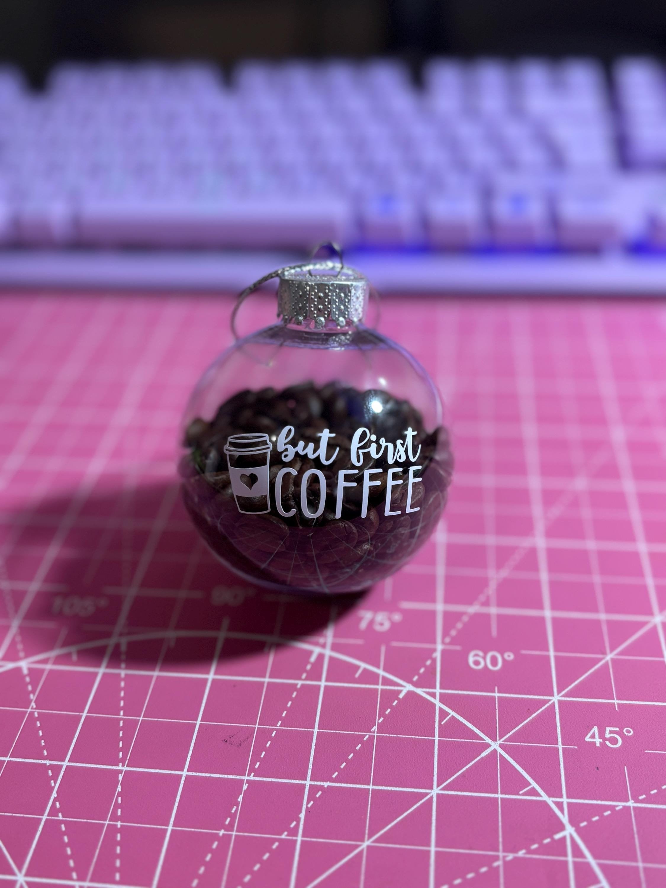 "Coffee Bean Bulb Ornament! These are clear plastic round bulbs that are filled halfway with co...