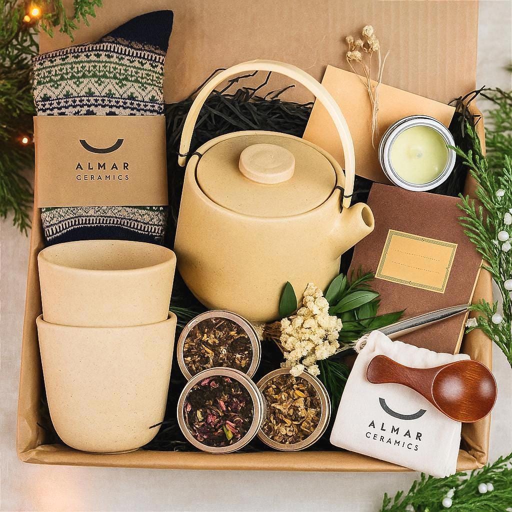 Tea gift box with handmade teapot ceramic tea cup and tea samples f...