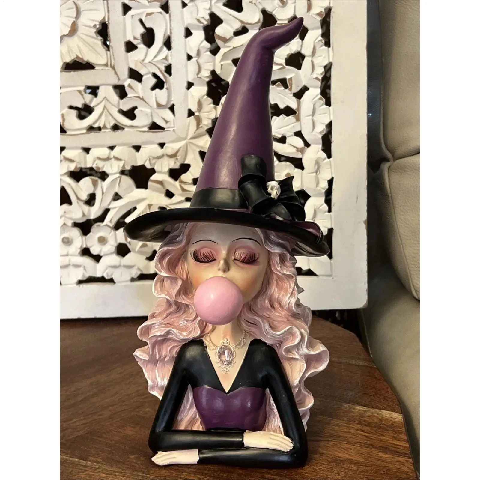 Witch Sculpture Witch Blowing Bubble Gum Resin Collectible Figurine Holiday Gothic Resin Sculpture C...