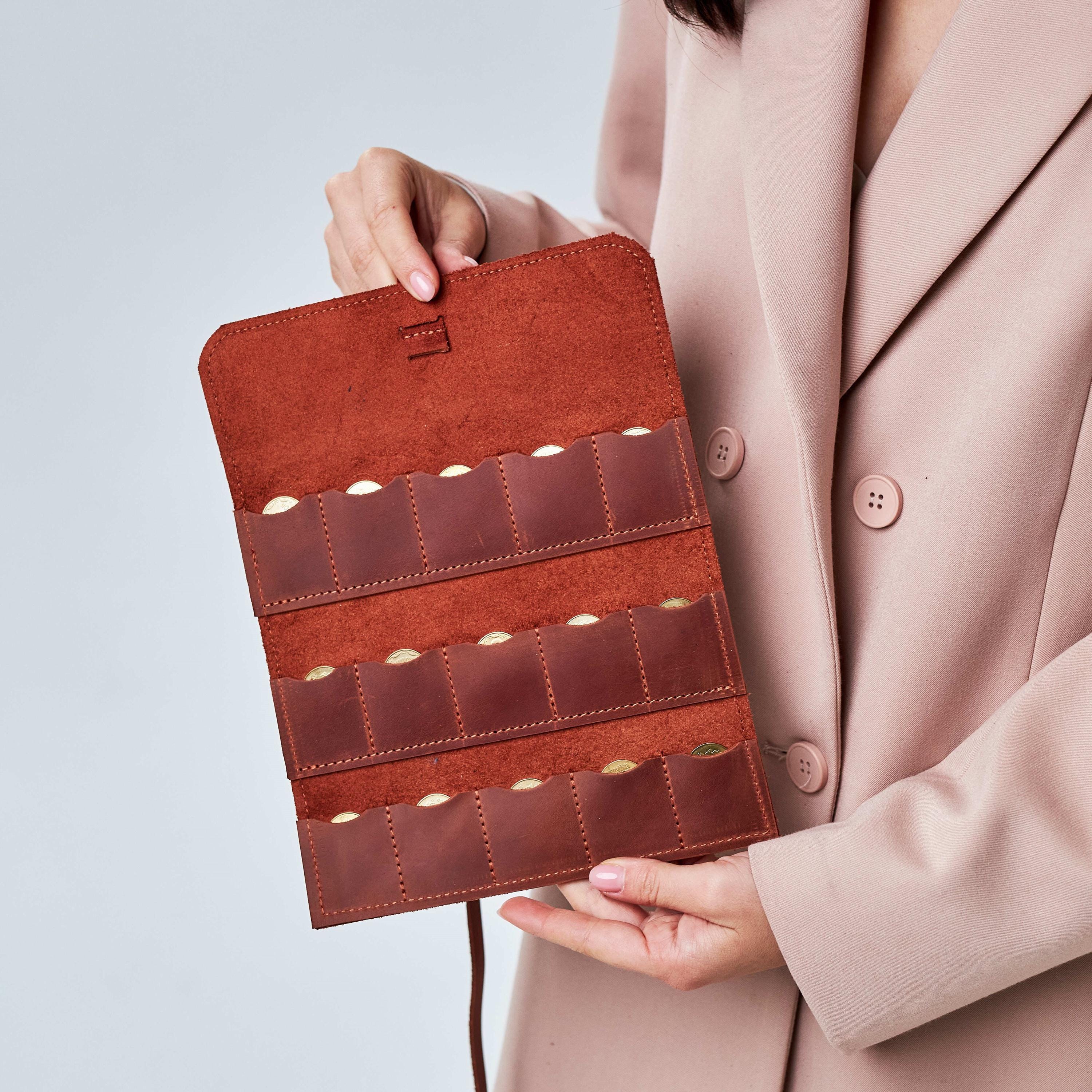 Leather coin roll Size - 26 x 20 cm (10.2 x 7.8 inch) 15 coin slots, 1 slot size: 4x3.5 cm (1.5x1.4i...