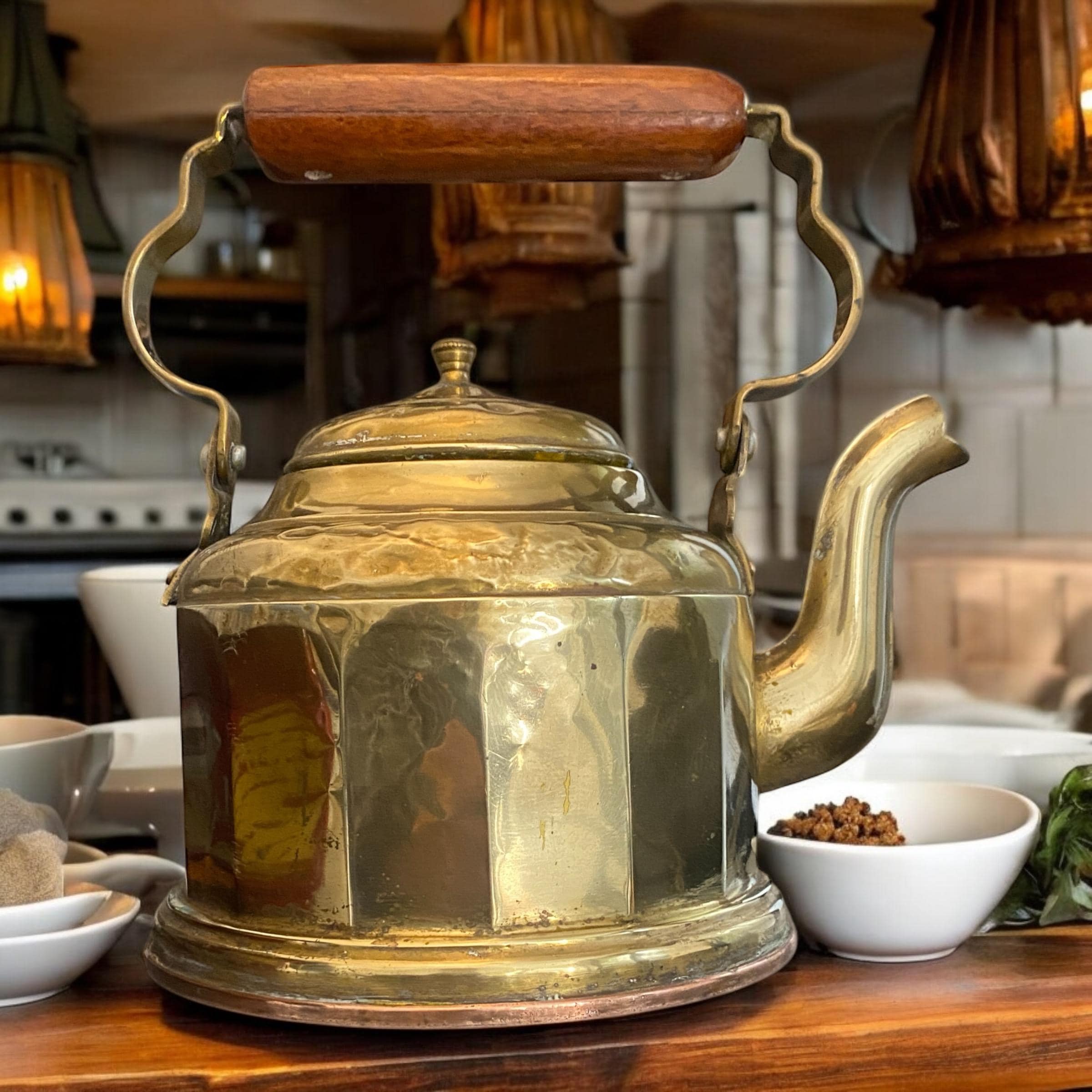 Vintage Brass Kettle with Wooden Handle, French Antique Teapot with...