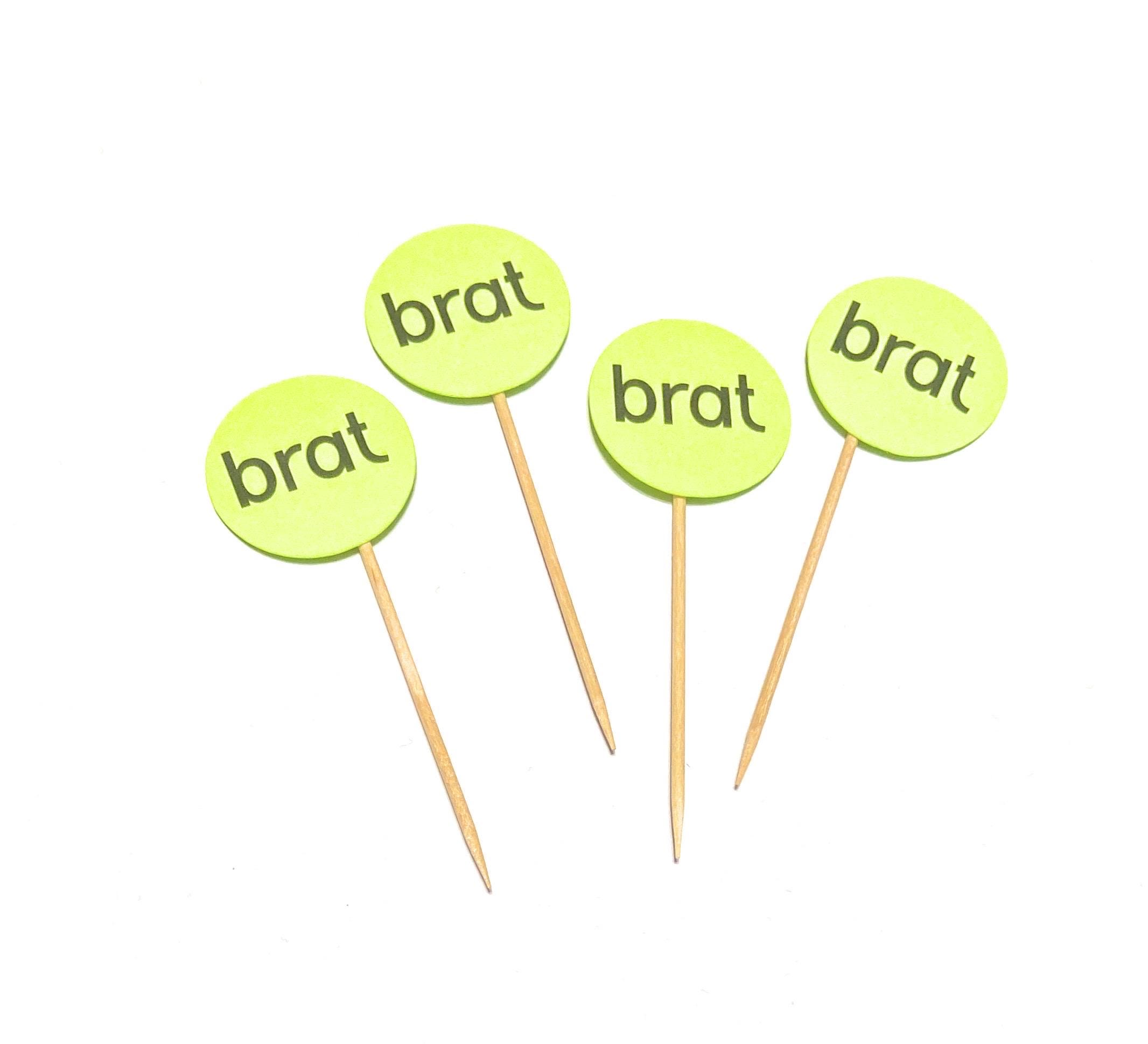 12 cake topper decorations on trend Brat party decorations - green card printed with Brat text mount...