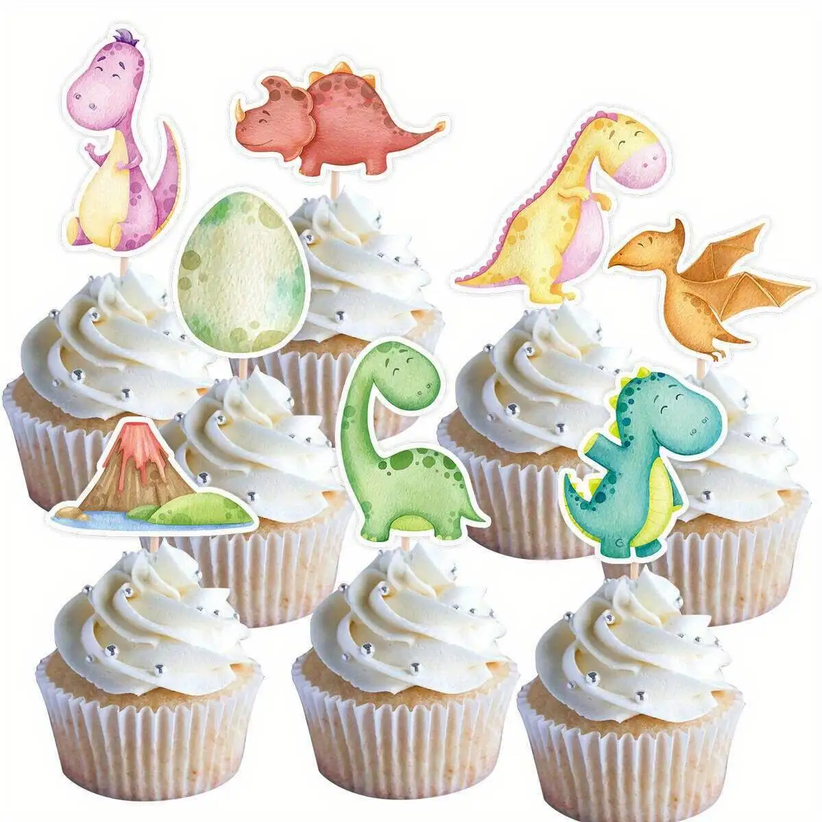 32Pcs Carton Dinosaur Cupcake Topper Watercolor Dinosaur with Bambo...