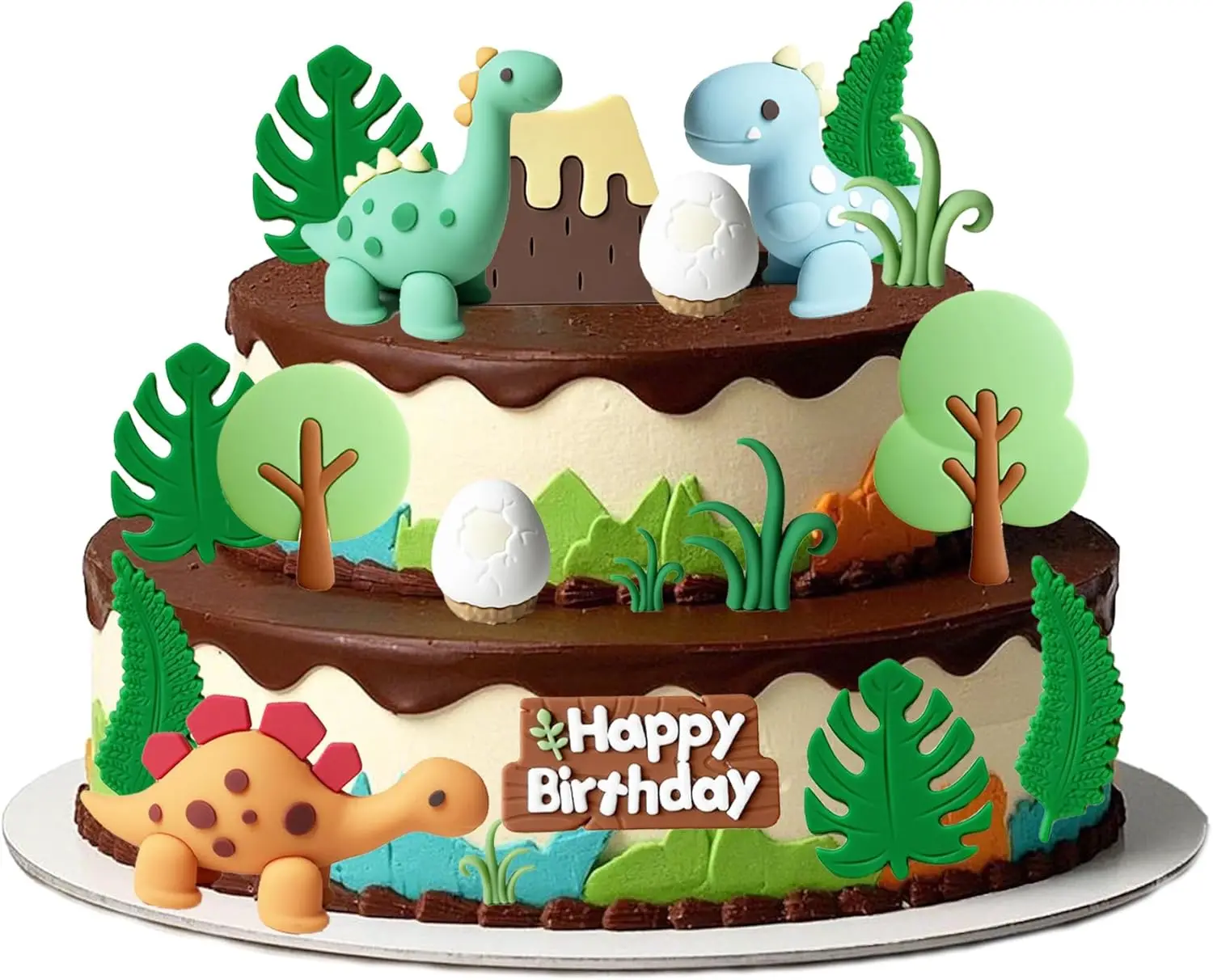 15PCS Cartoon Dinosaur Cake Toppers, Cute Dino Egg Leaves Grass Volcano Cake Decorations for Kids Bi...
