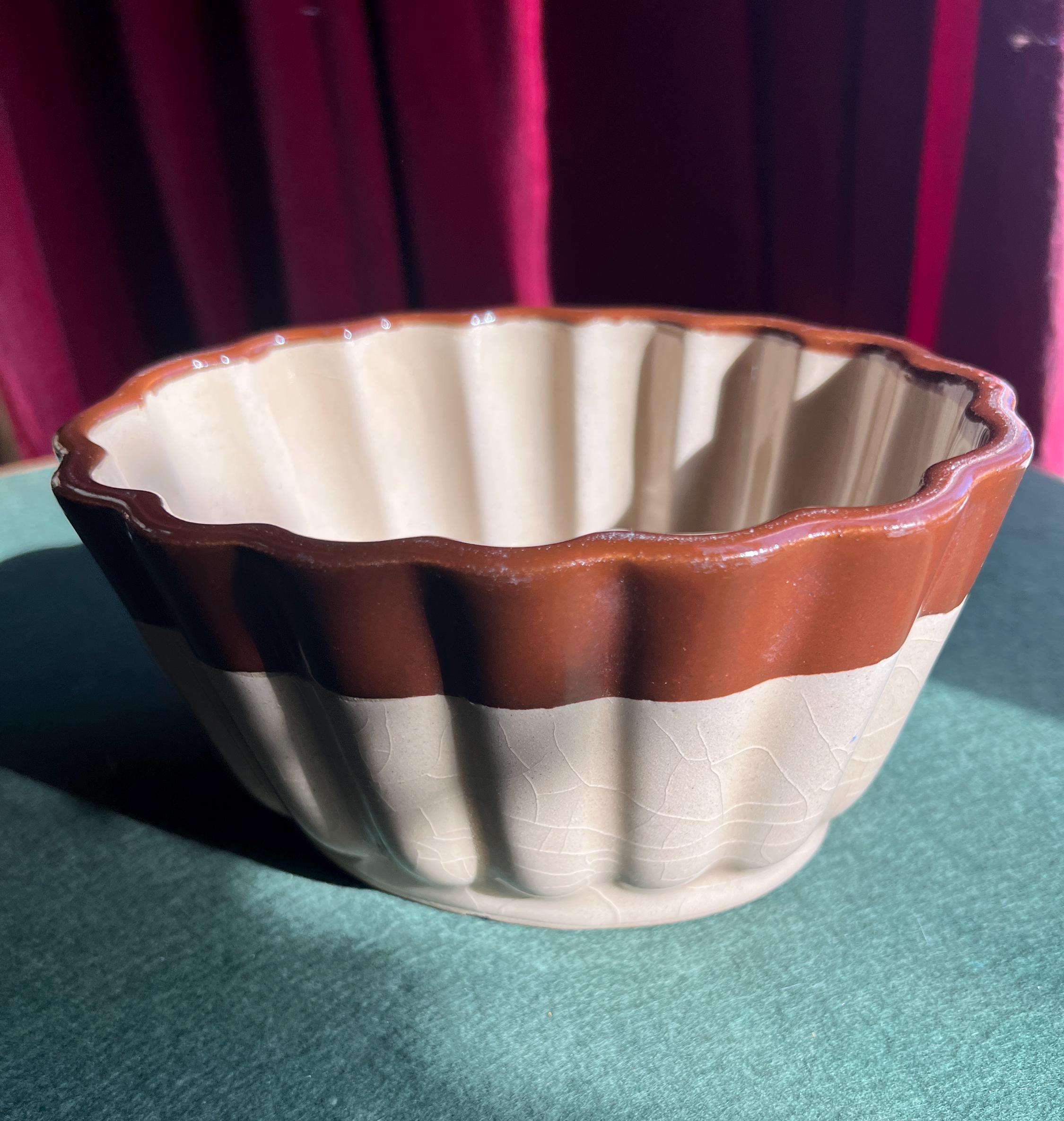 Vintage stoneware jelly aspic mould. Stamped Bourne Denby England. Brown cream glaze large blancmang...