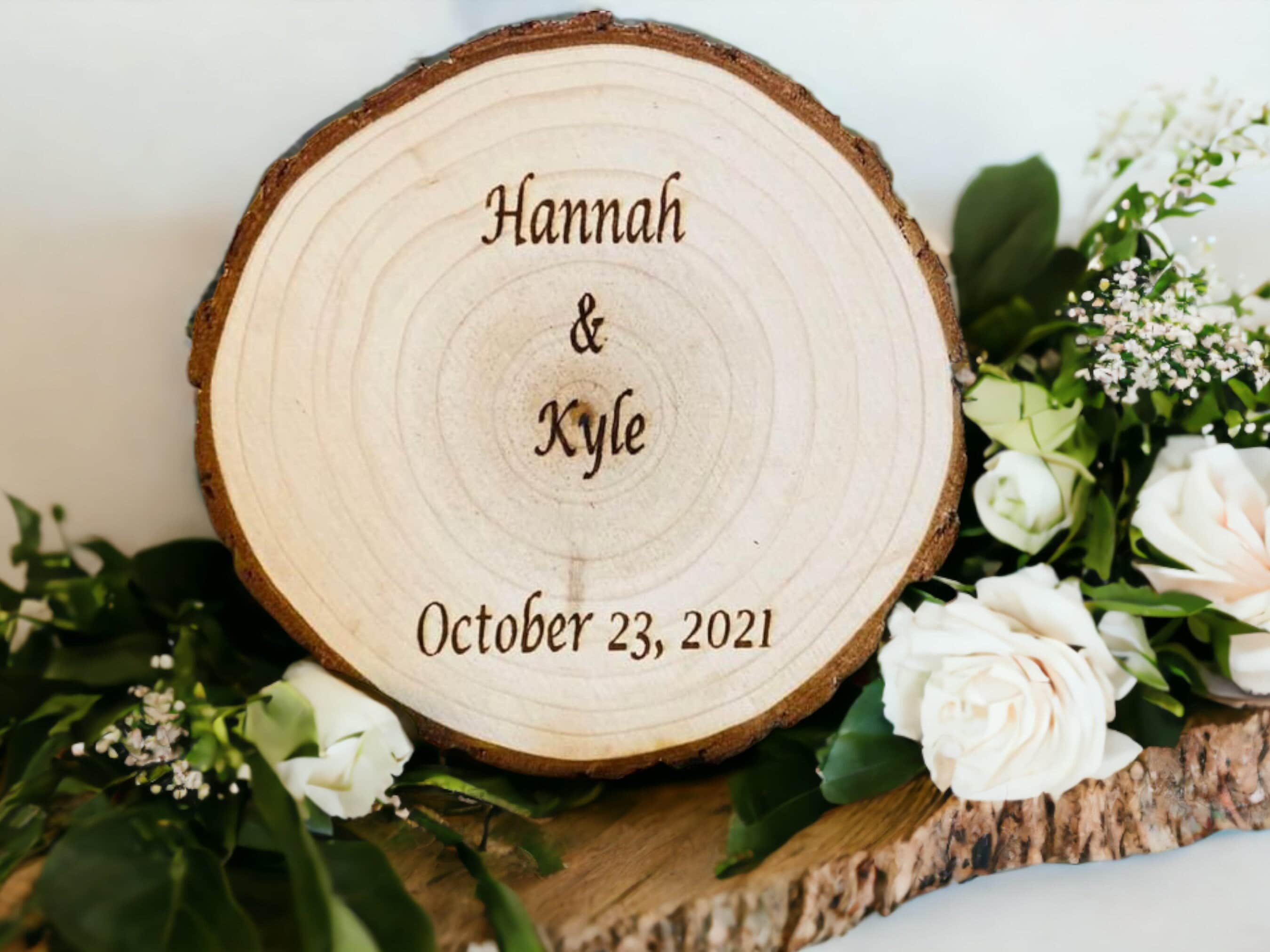 Engraved Wood Slice Cake Topper: Rustic Wedding Centerpiece