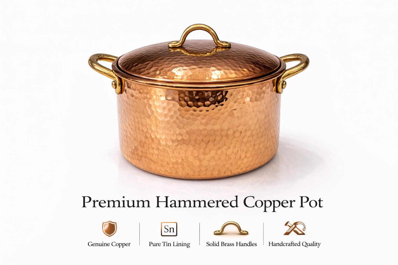 Premium Handcrafted Hammered Copper Cooking Pot | Tin Lined | Solid Brass Handles | Professional Lux...