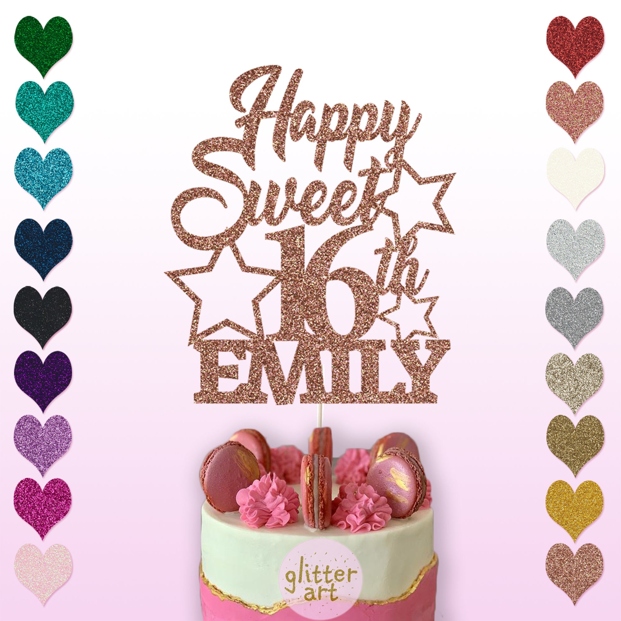 Personalised Glitter Cake Topper, Custom Happy Sweet 16th Cake Topp...