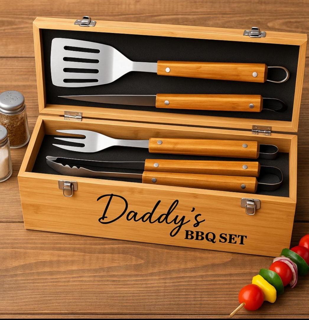 Personalised Name Wooden BBQ Tool Set Gifts Ideas For Barbecue Fath...