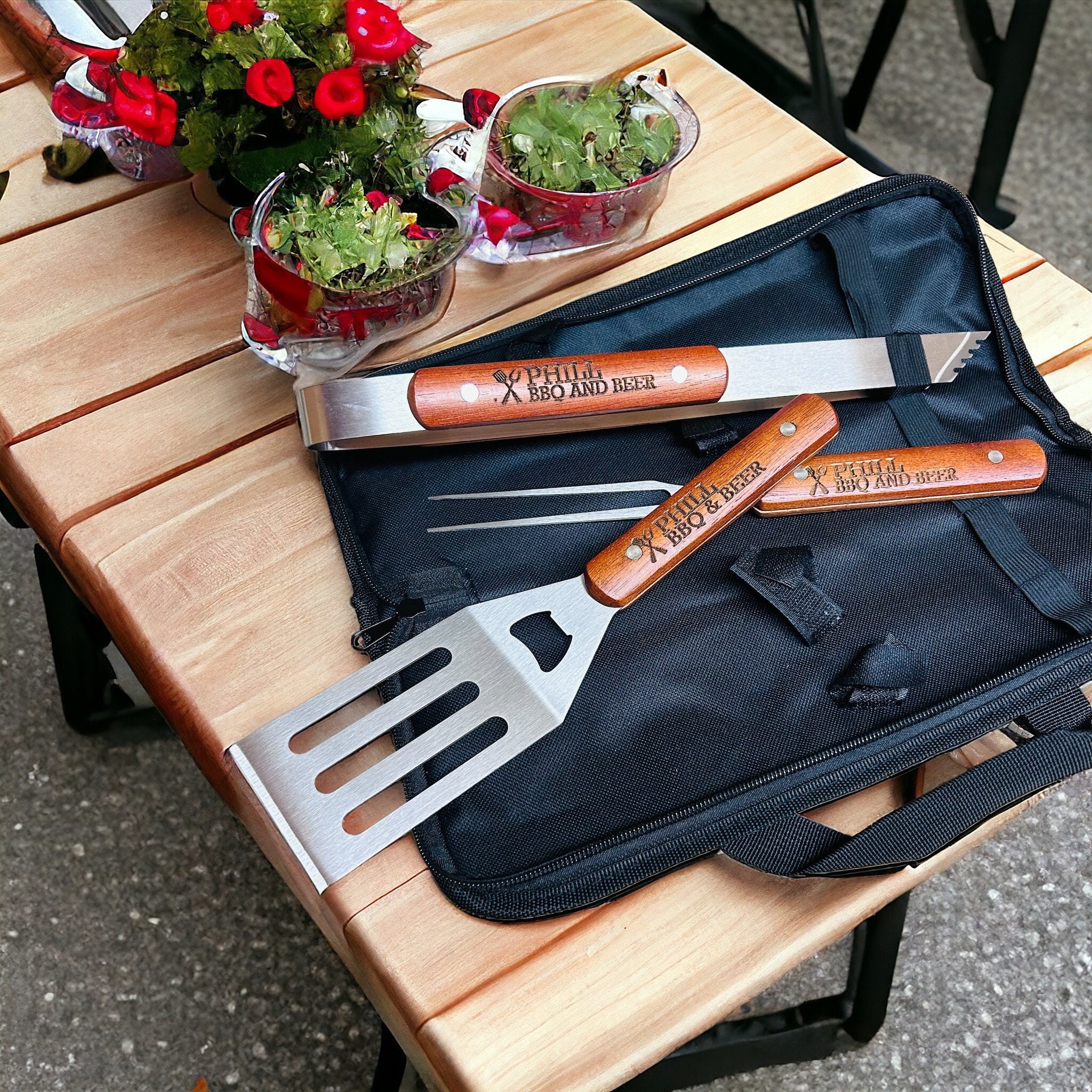 "Personalized Stainless Steel Barbecue Tools with Case - 3 Piece BBQ Tools Gift Set - 3 Lines o...