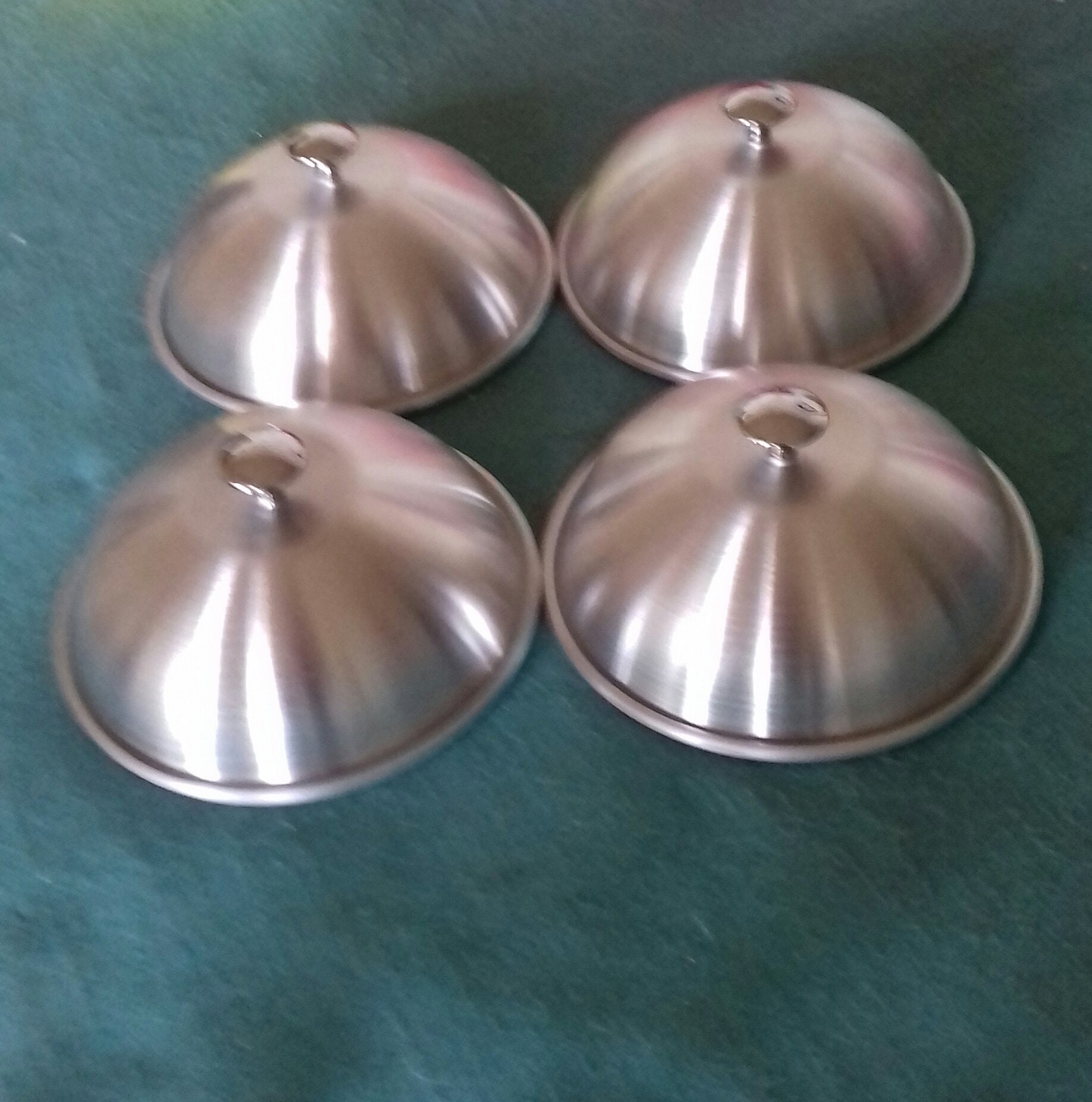 A set of 4 hand spun aluminium basting domes with metal knobs. A larger basting lid for bigger burge...