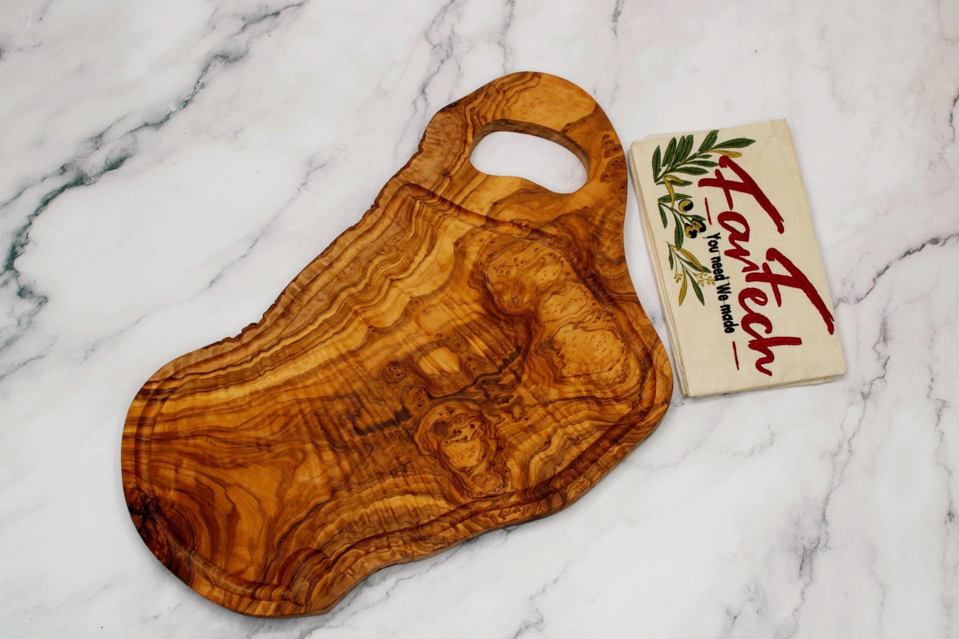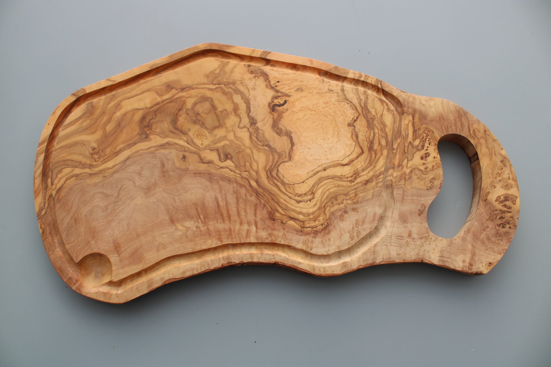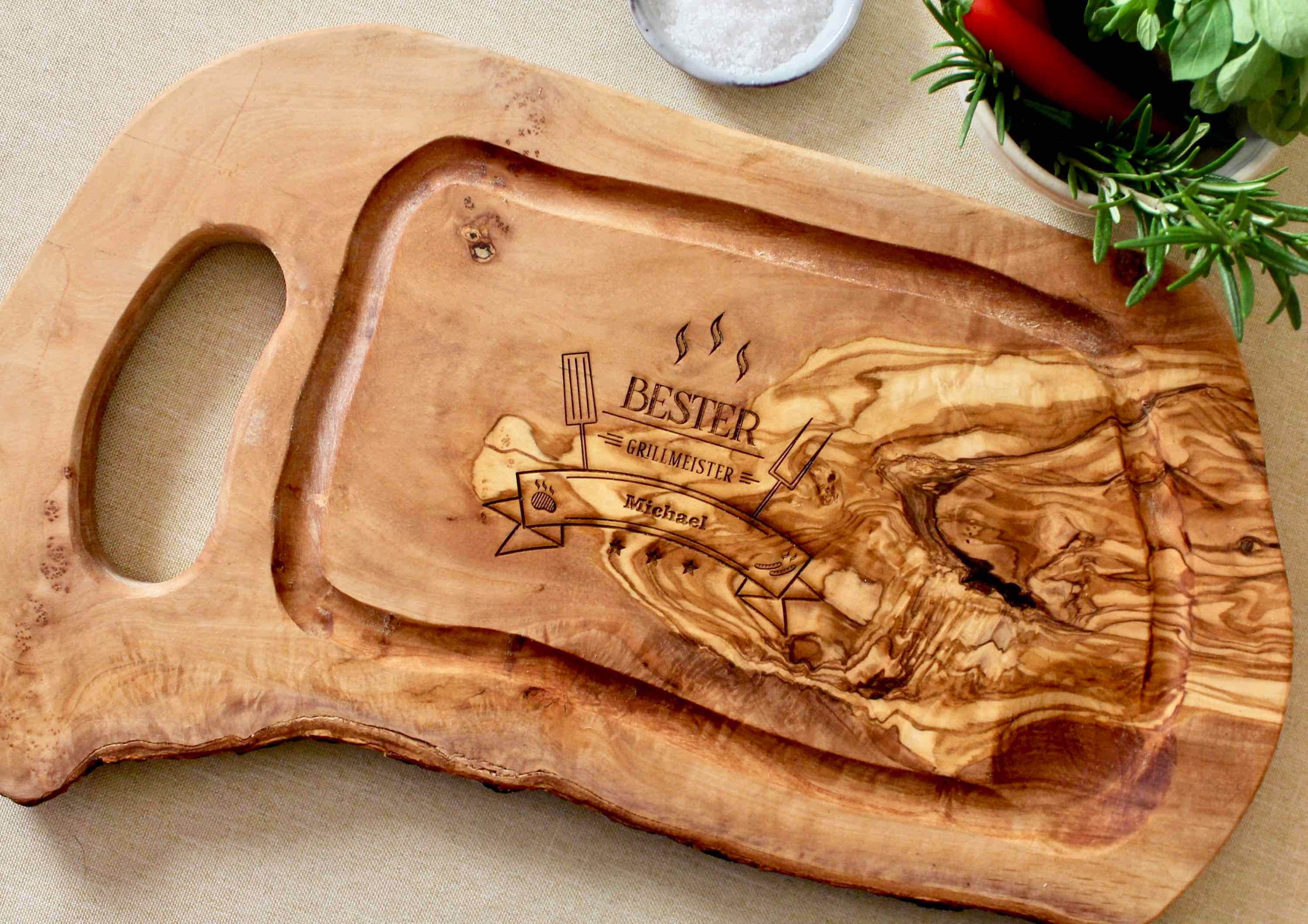 Rustic olive wood steak board with juice groove and handle - robust, handmade and sustainable - idea...