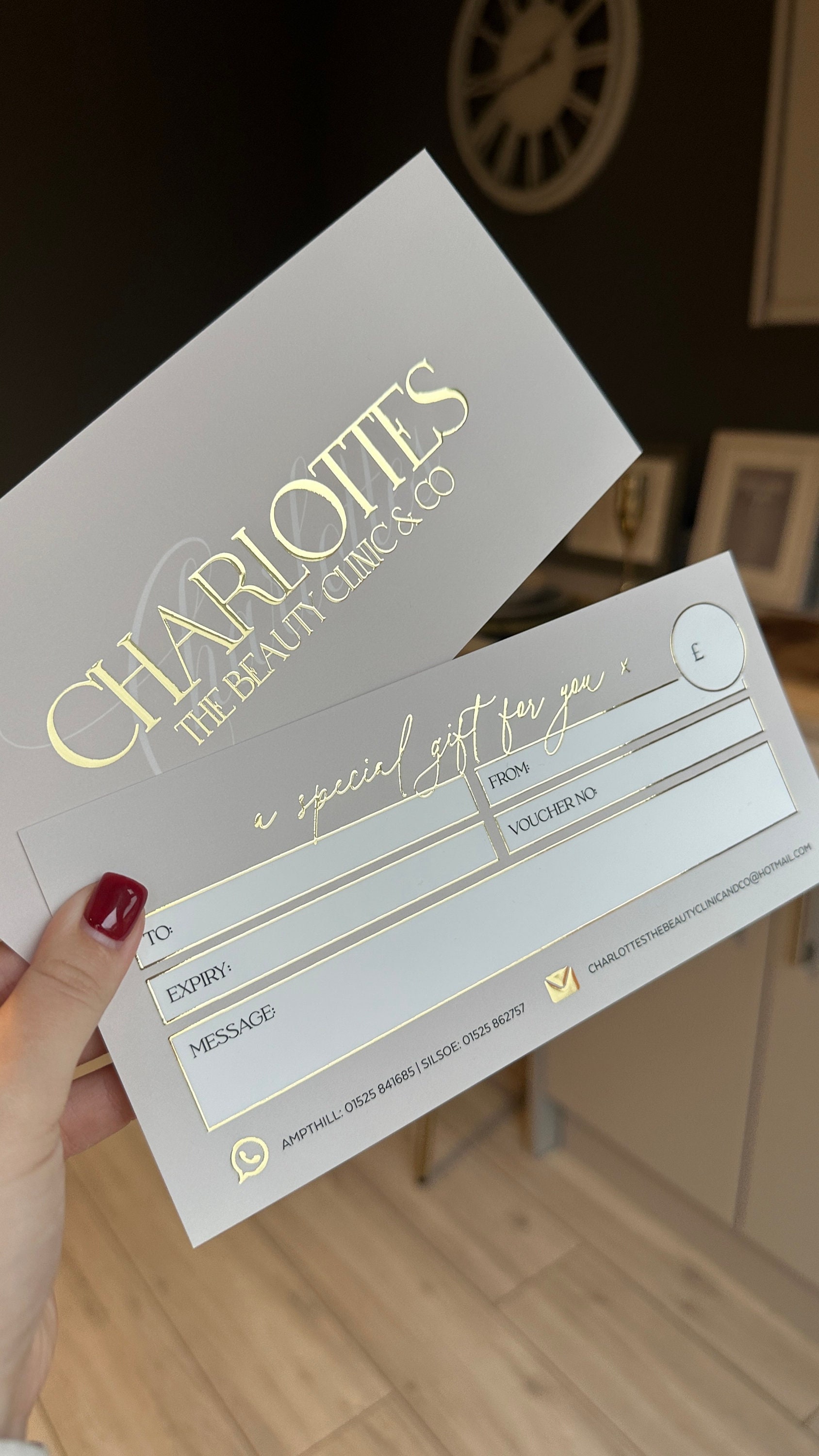 "Bespoke gold or silver raised foil gift vouchers, designed specifically to you with your logo ...