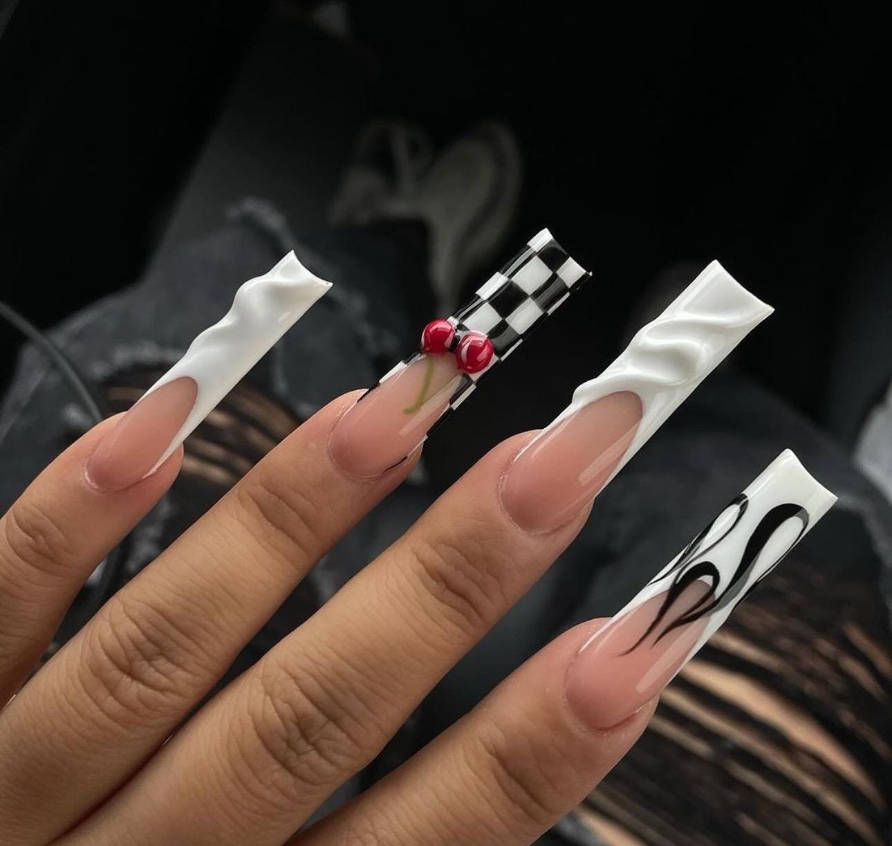 3D Retro White French Tip Checkered Cherry Press On Nails|3D Nails|...