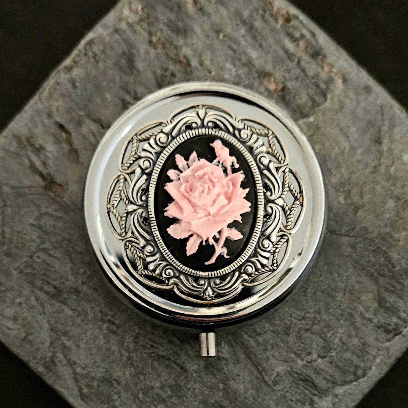 Rose cameo pill box container, silver pill box, pink rose silver pi...