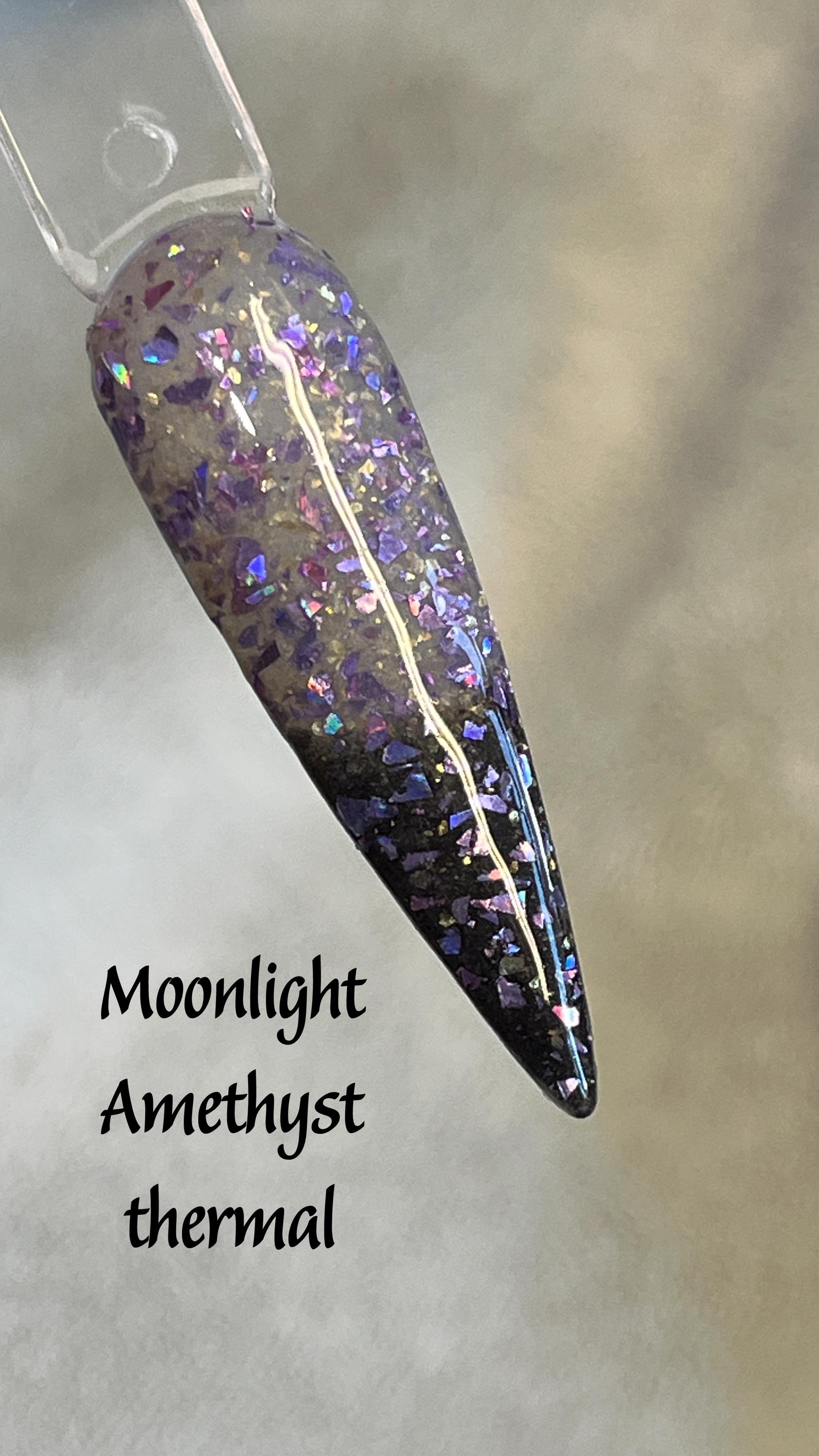 Moonlight Amethyst Dip Powder is a thermal dip that has light purple holo flakes. It's black when co...