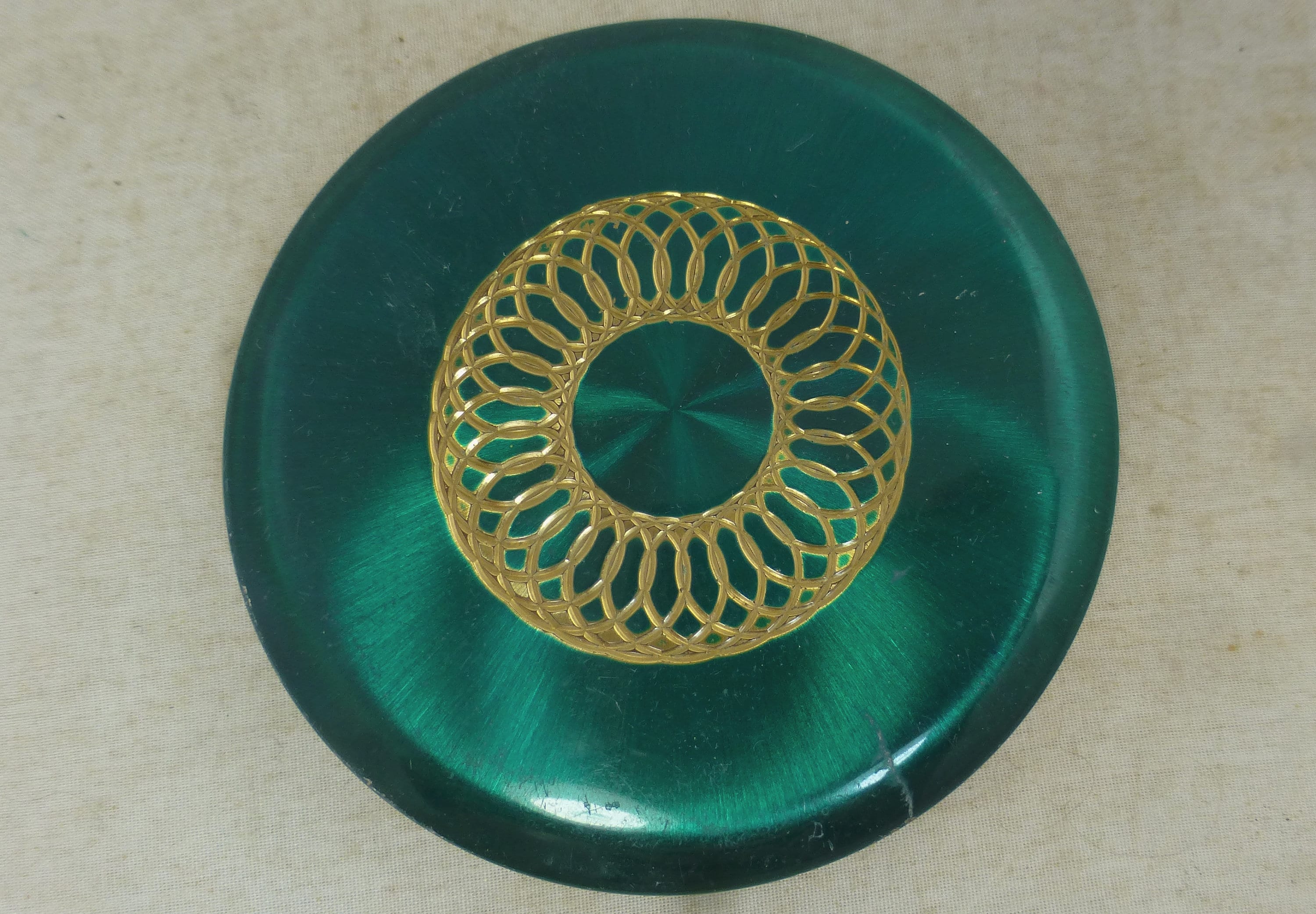 Vintage Kigu Gold Circle Design on Shiny Green Enamel Hand Held Gol...