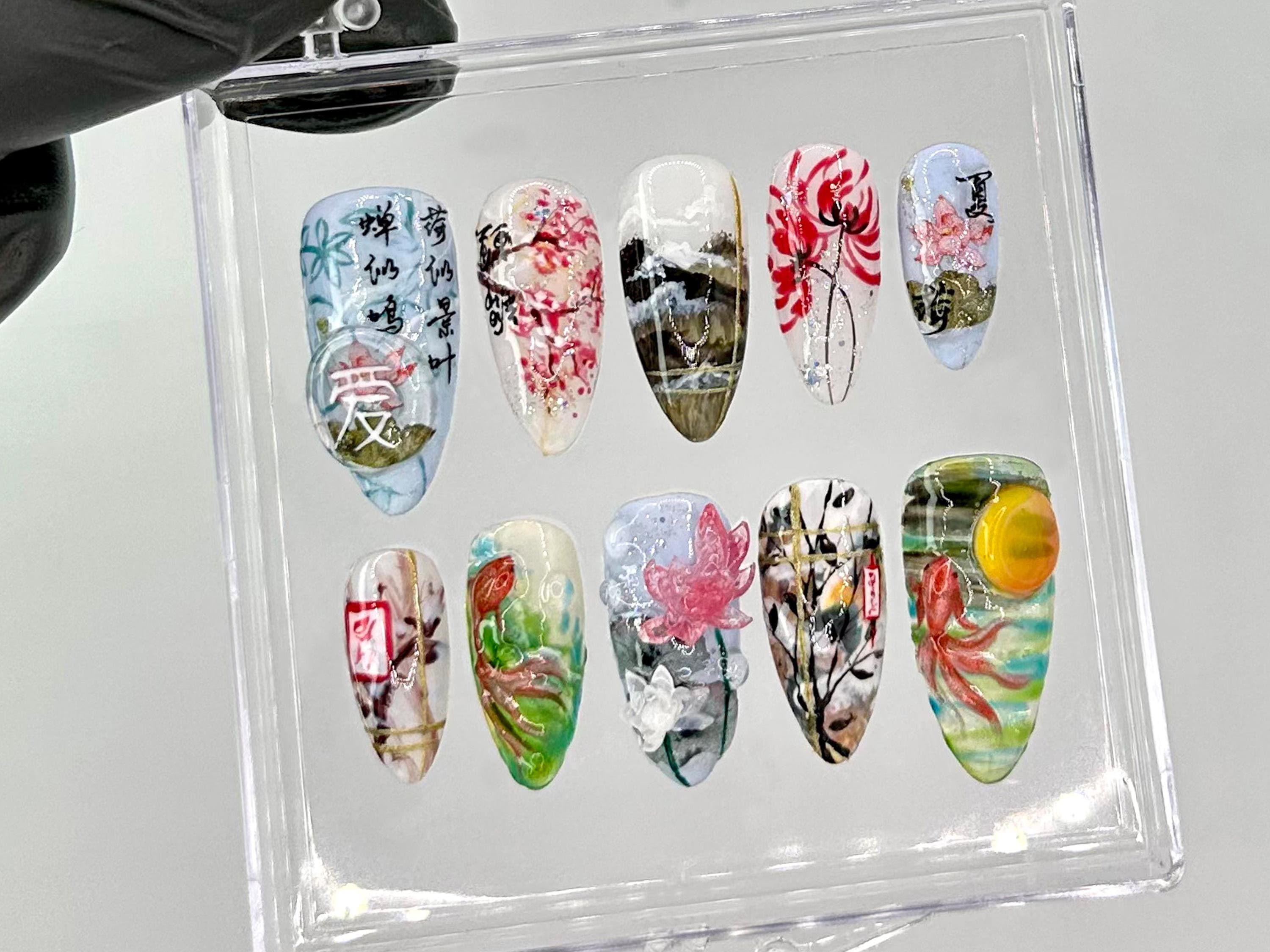 Hand Painted Press On Nails: Fish & Bamboo Design, Reusable Fau...