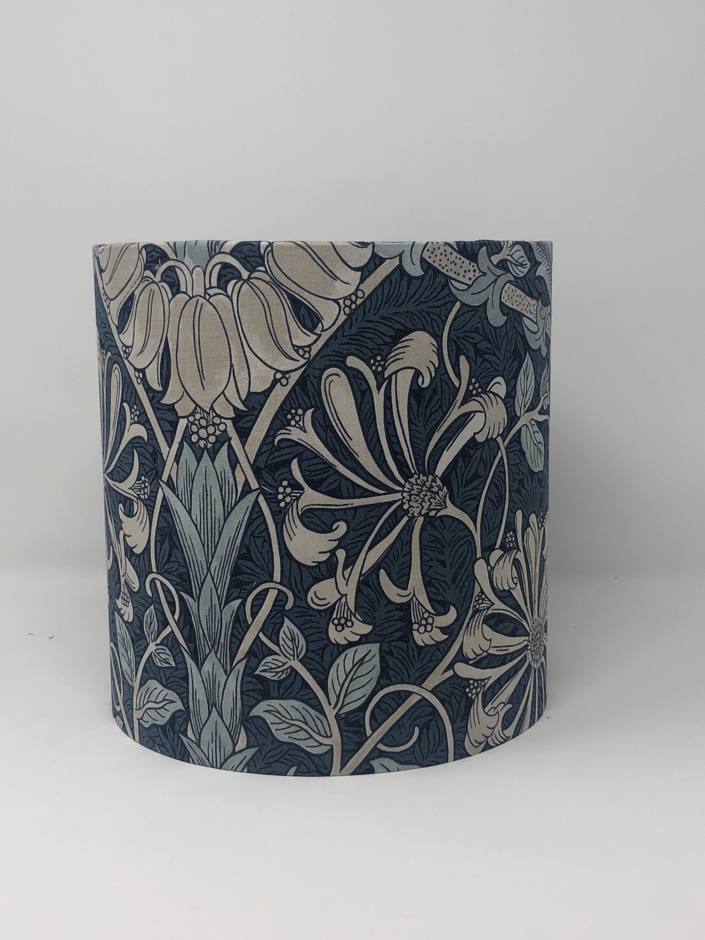 Handmade William Morris Lampshade in a Honeysuckle and Tulip printed fabric design. Navy and silverc...