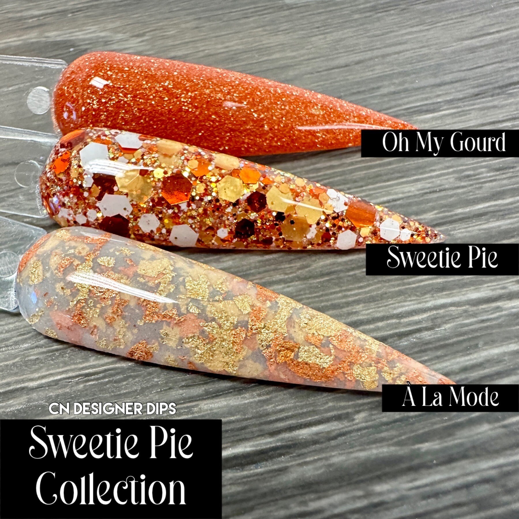 Dip Powder - Acrylic Powder - CN Designer Dips -Oh My Gourd is a medium burnt orange with golden mic...