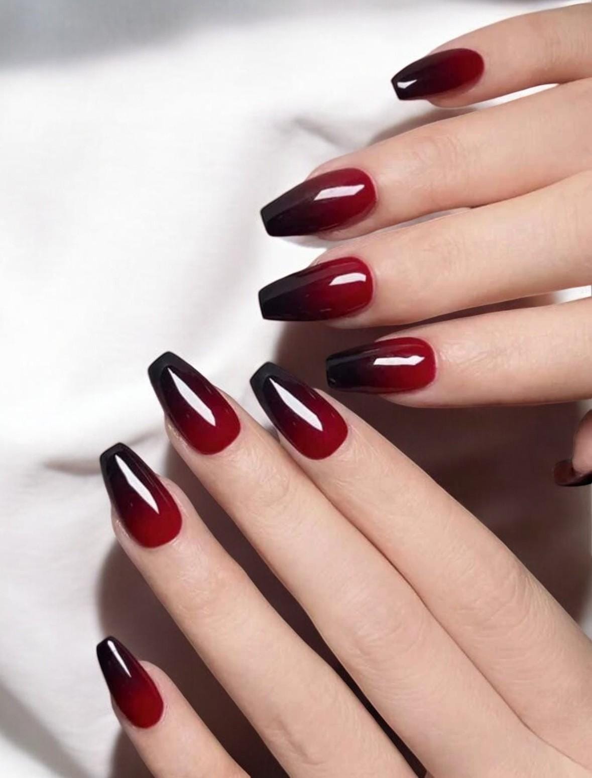 Red and black gradient false nails - Dark red press-on nails - Reus...
