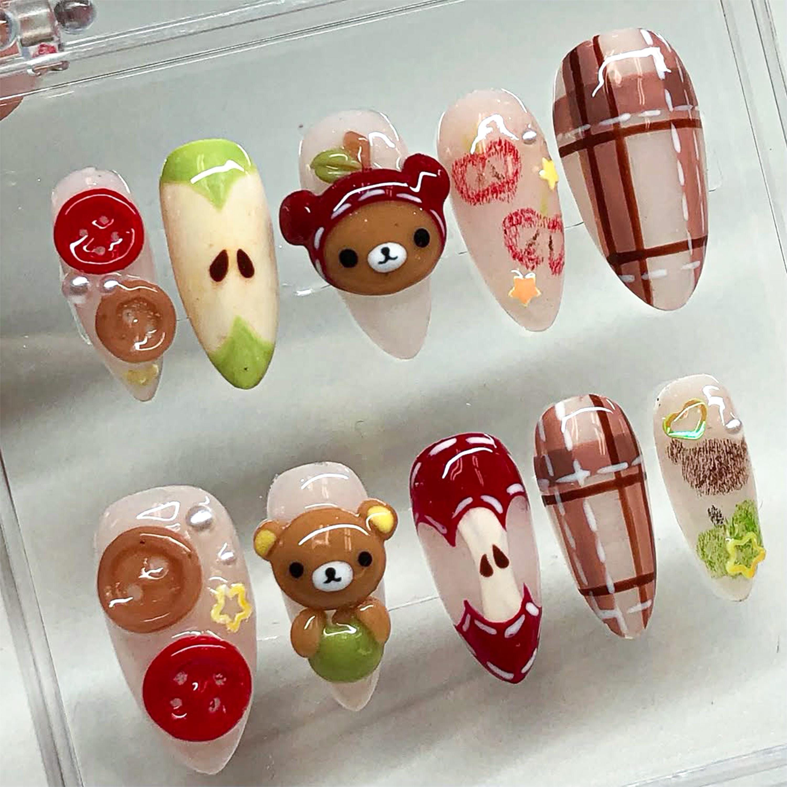 Rilakkuma and Apple-Themed Press On Nails, Cute 3D Handmade Nail Ar...