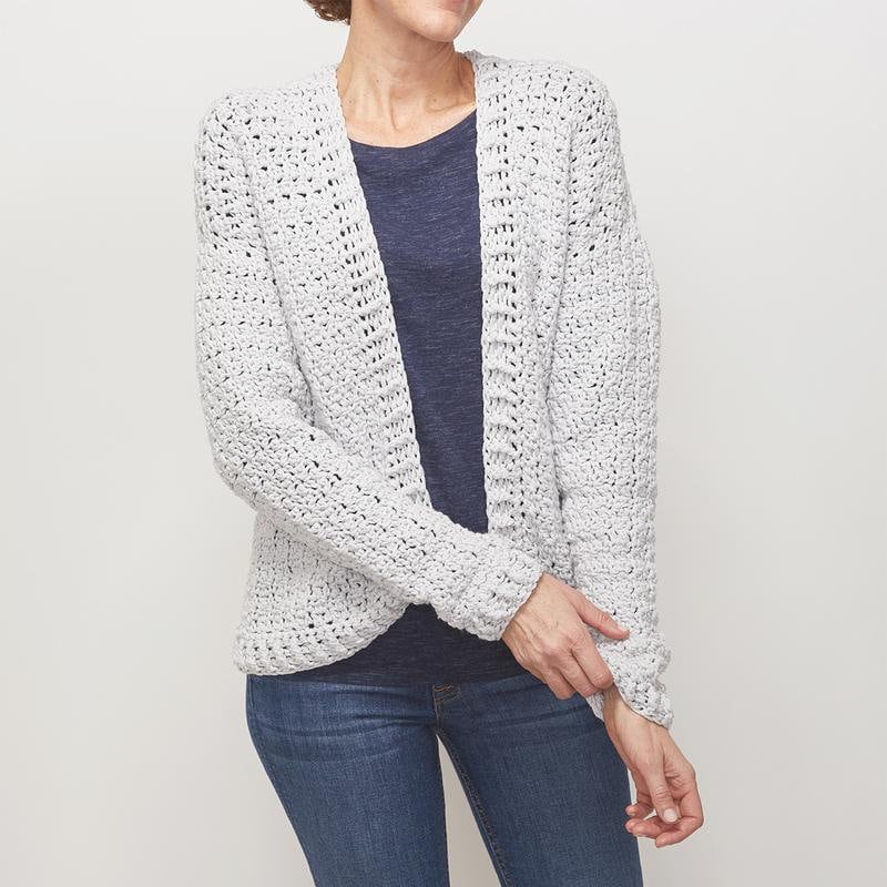 This easy two-row repeat crochet cardigan pattern uses a breathable yarn making it ideal for year-ro...