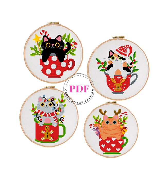 Set of 4 Christmas cats cross stitch patterns Cute cross stitch cha...