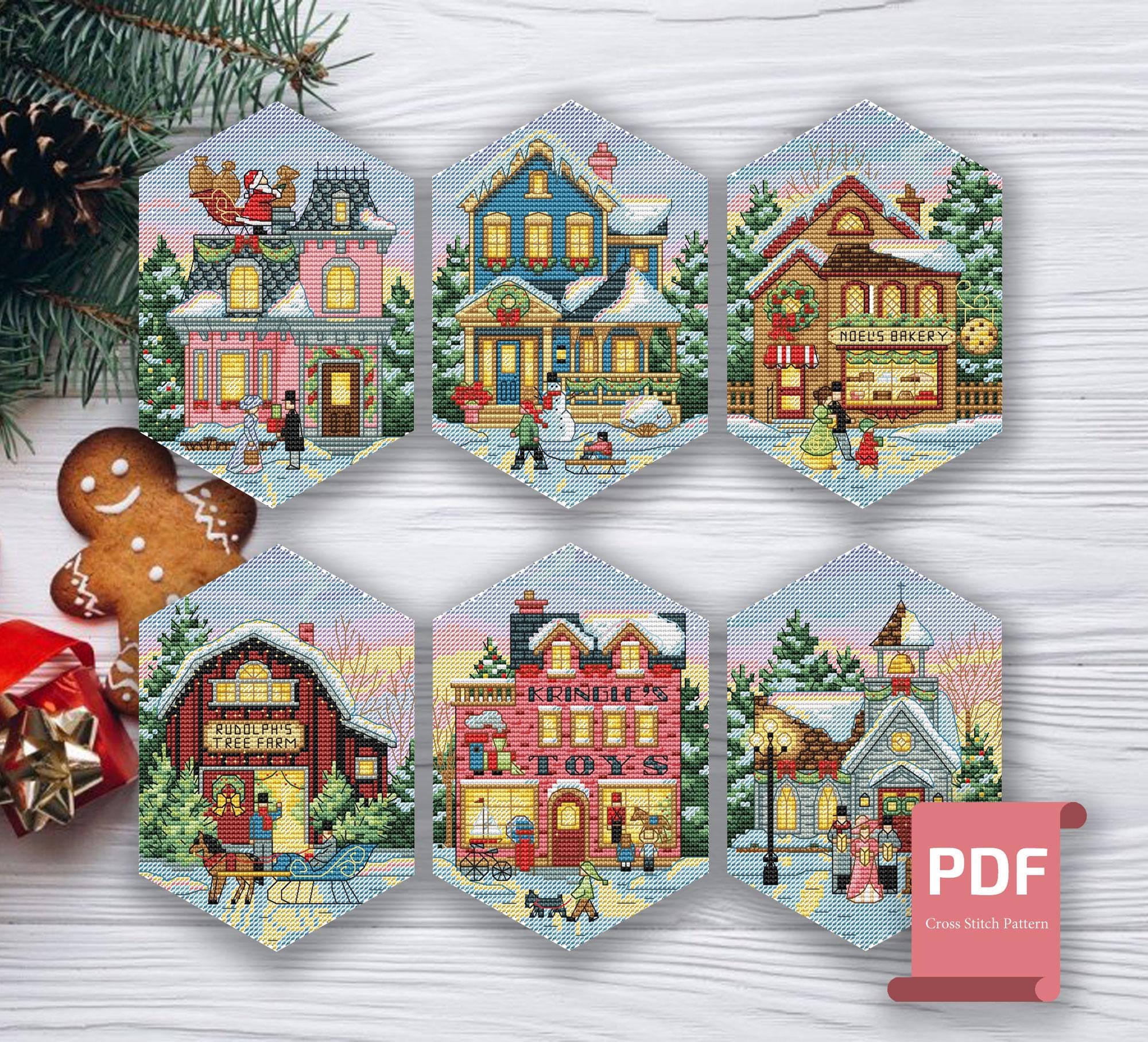 Set of Christmas Village Ornament Cross Stitch | Evening Cross Stit...