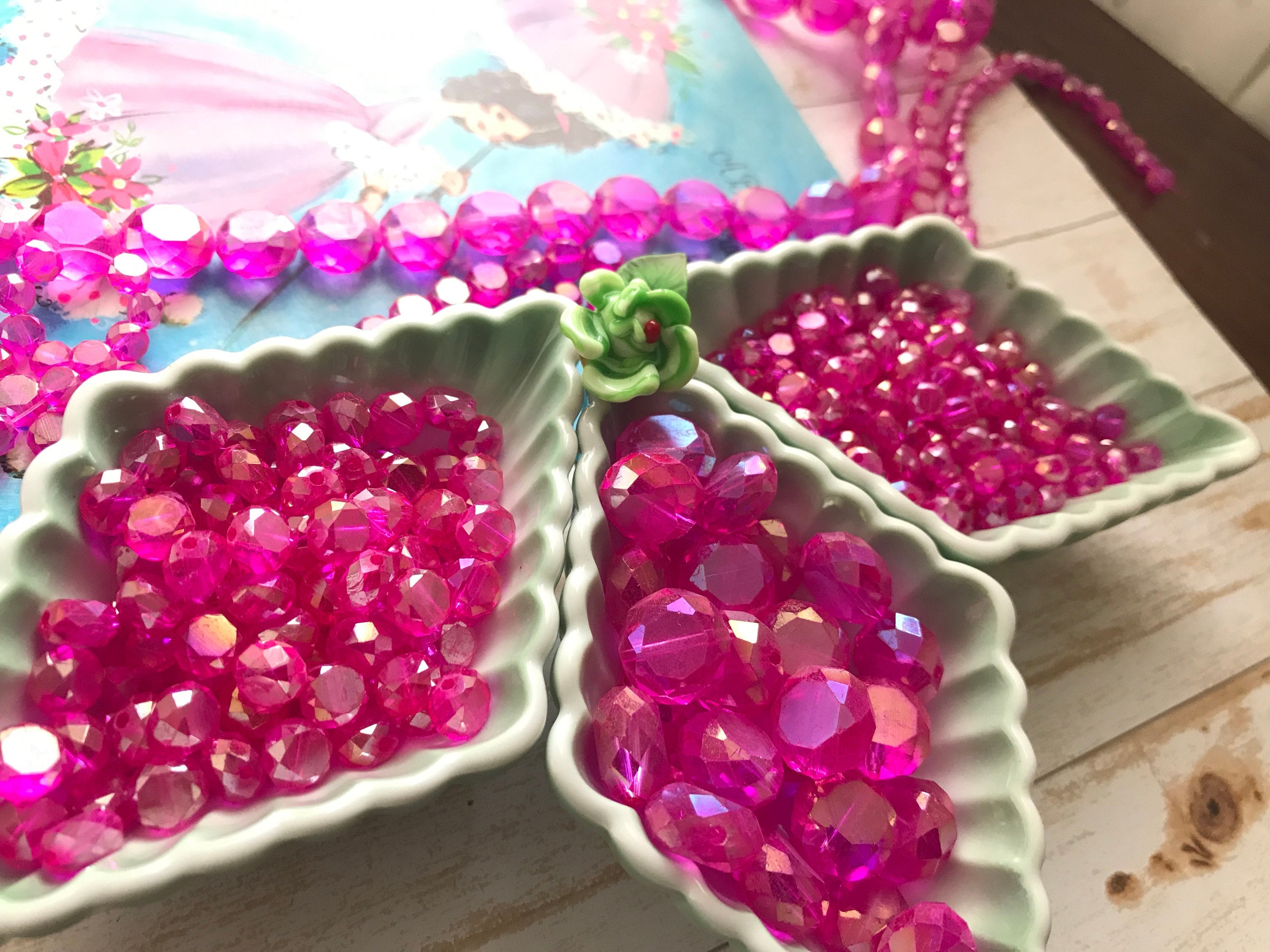 Fire Polished Pink beads, Hot Pink Glass Beads, Faceted beads, window beads, vintagerosefindings, be...
