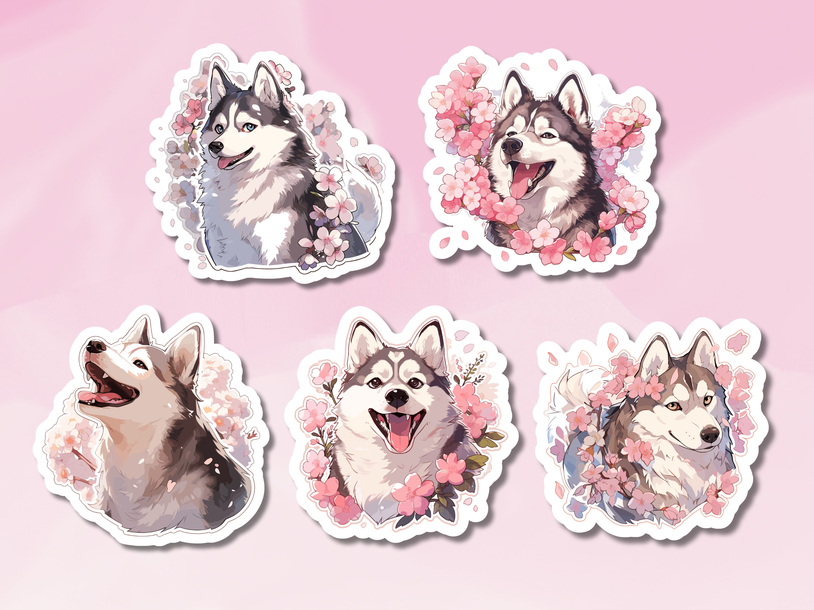 Cute Husky Sticker, Flower Husky Sticker, Dog Sticker Set, Cute Dog...