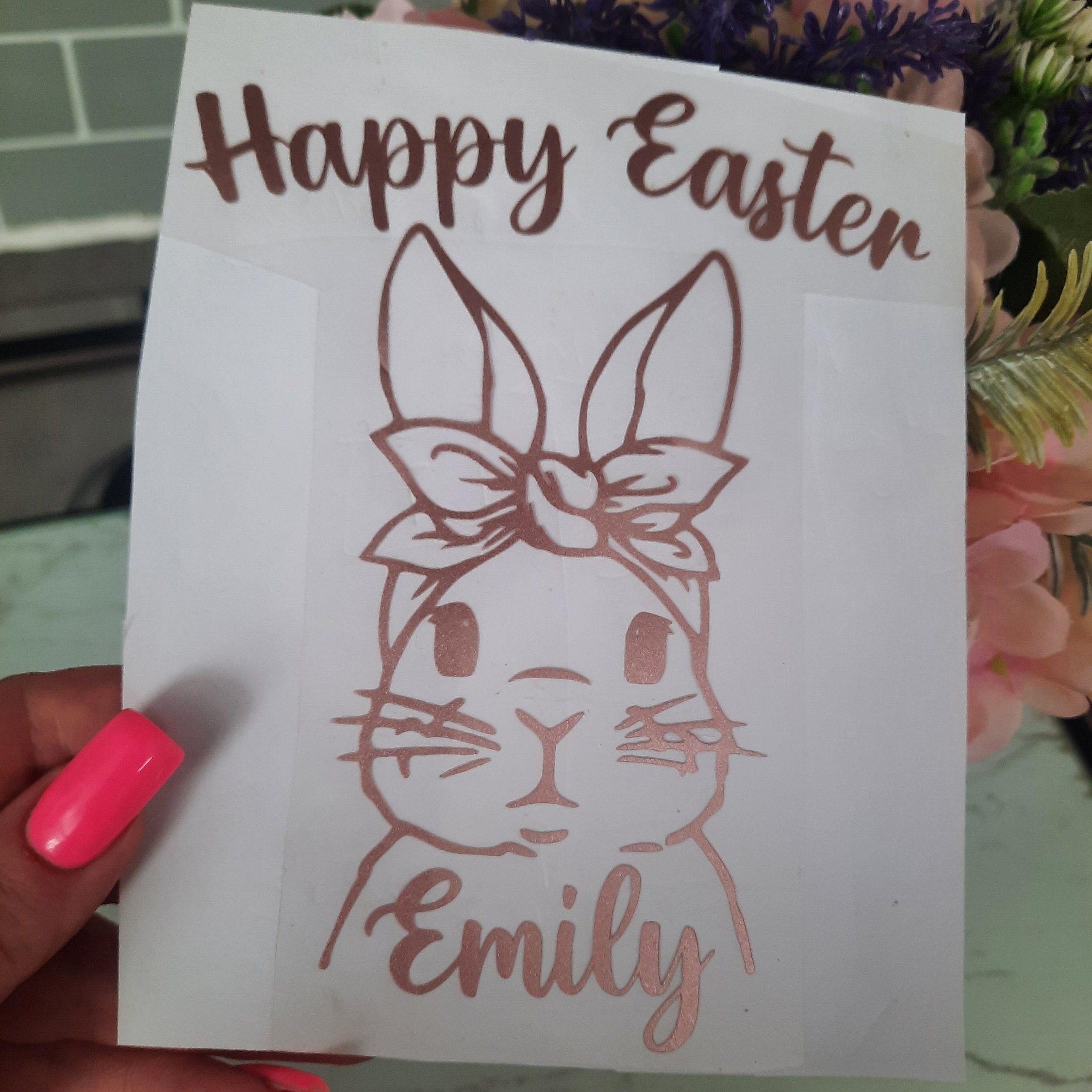 "Personalised rose gold \"Happy Easter\" Easter bunny iron on tshirt transfer Availab...