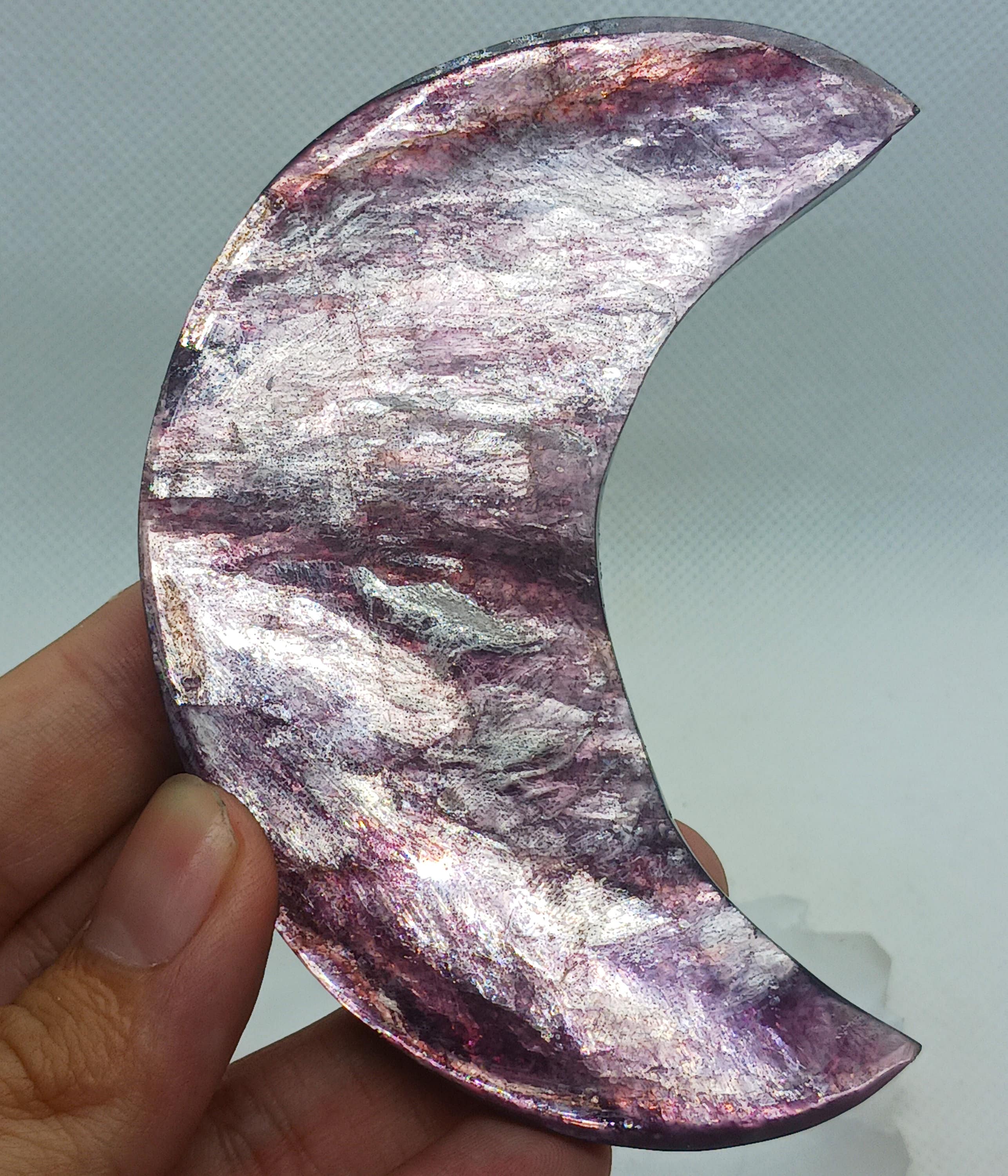 "Large polished gem quality lepidolite moon with incredible reflective shine and beautiful purp...