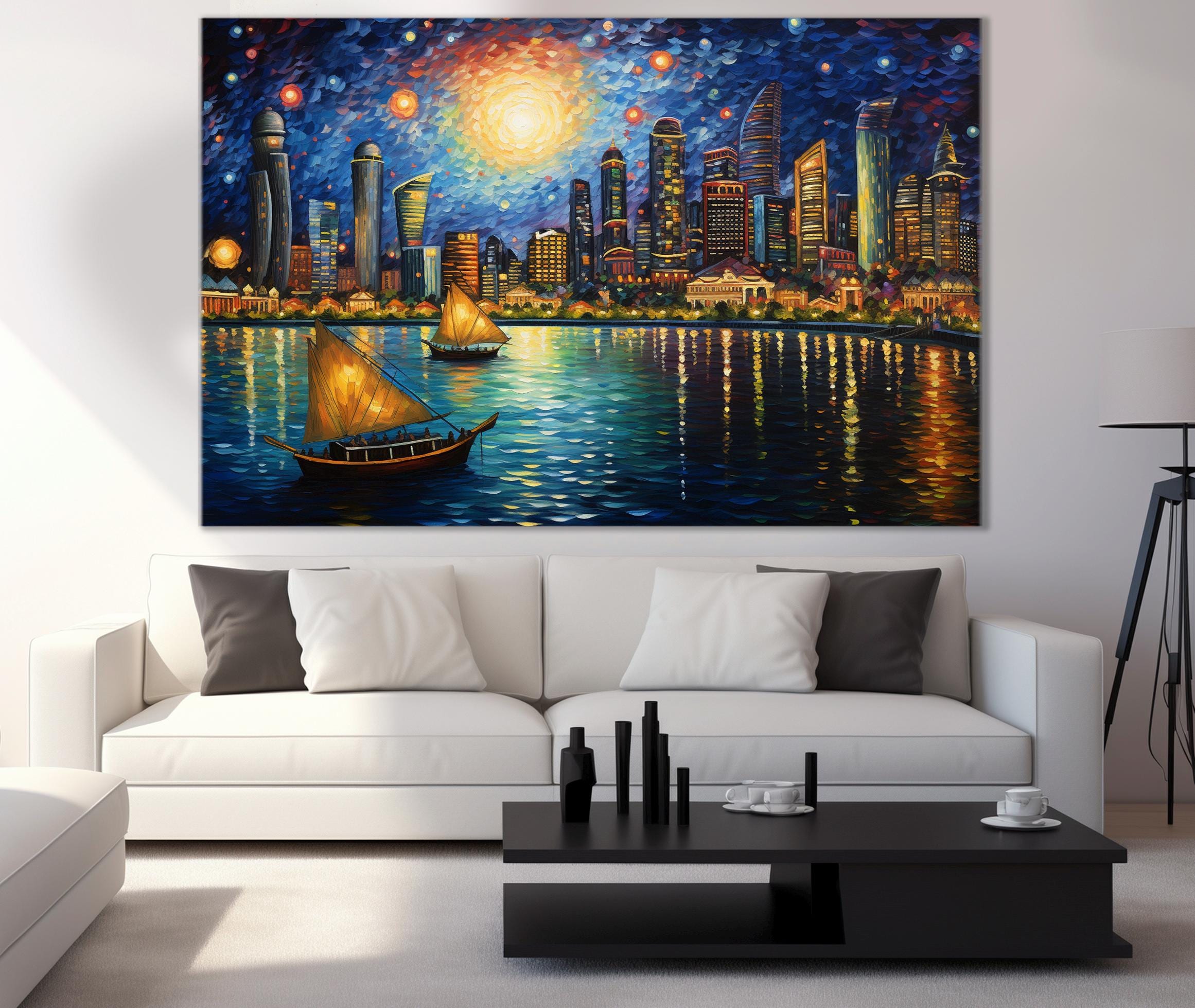 Singapore Canvas Print in Van Gogh Starry Night Style, Singapore Sk...