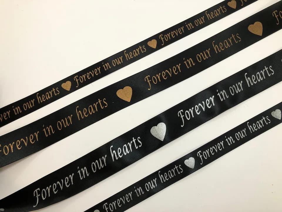 "A Black satin ribbon with \"Forever in our hearts\" printed in matt silver or matt g...