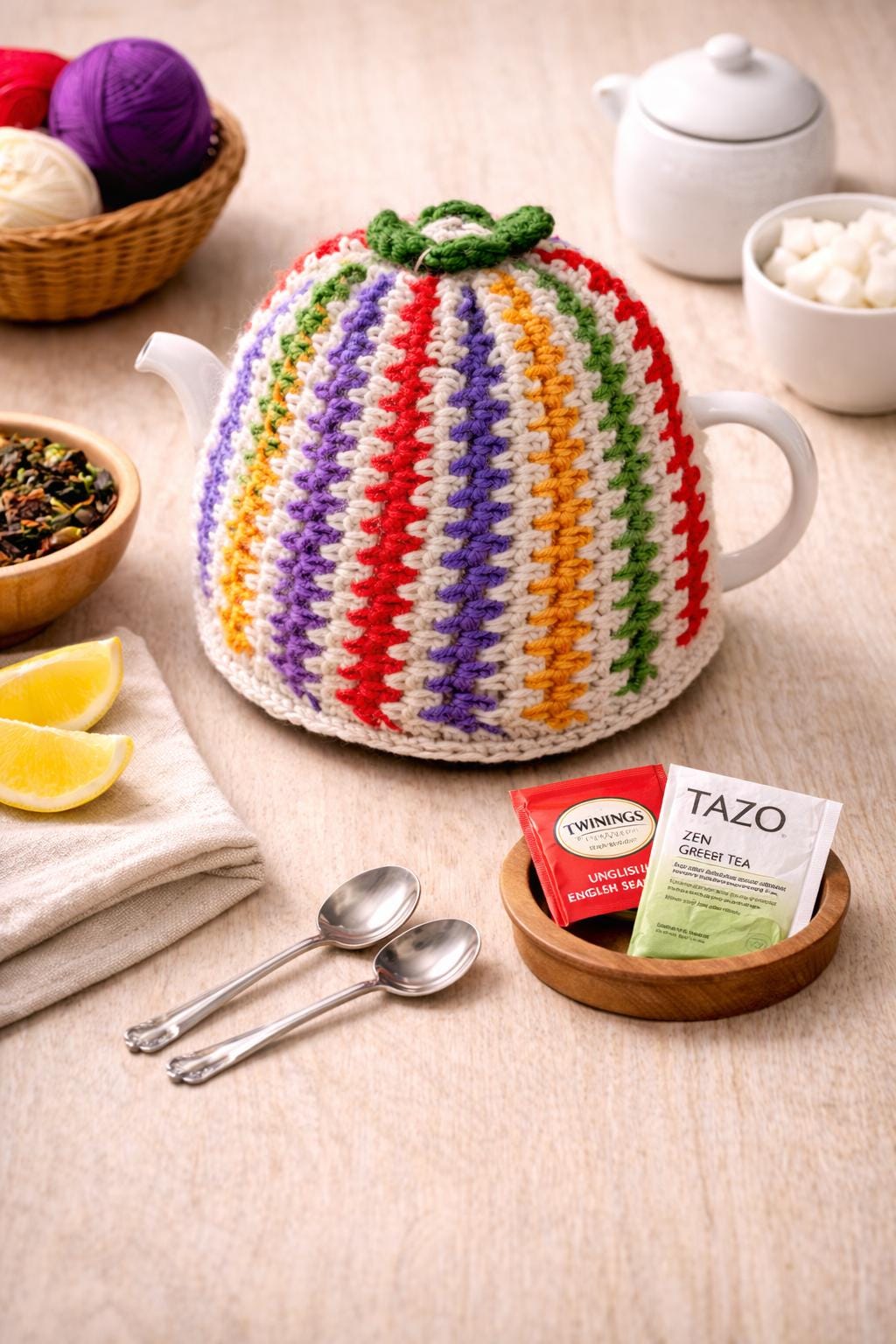 1970s retro teapot cozy pattern PDF to crochet. This easy breakfast cozy teapot has vertical stripes...