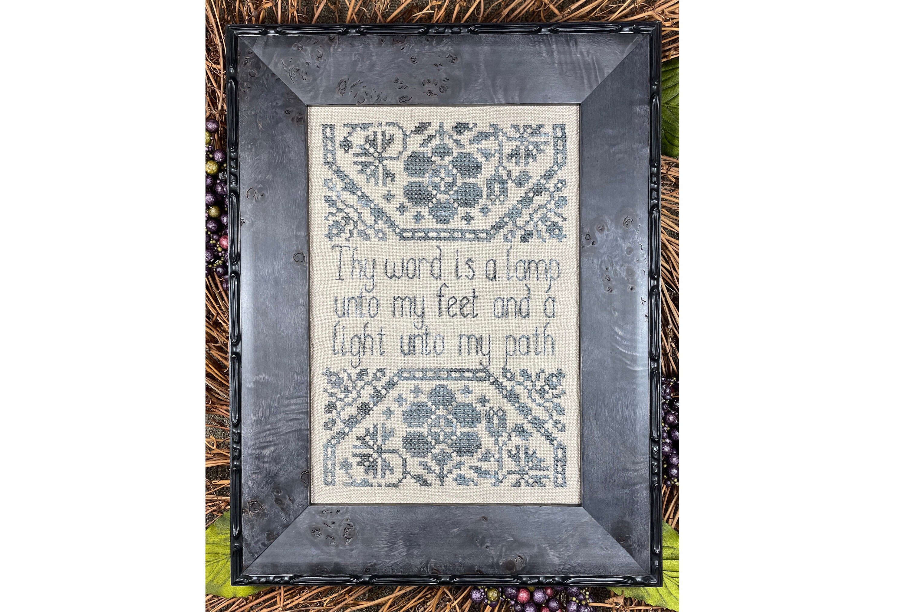 "This cross stitch pattern is an elegant Quaker style piece with selections from Psalm 119:105 ...