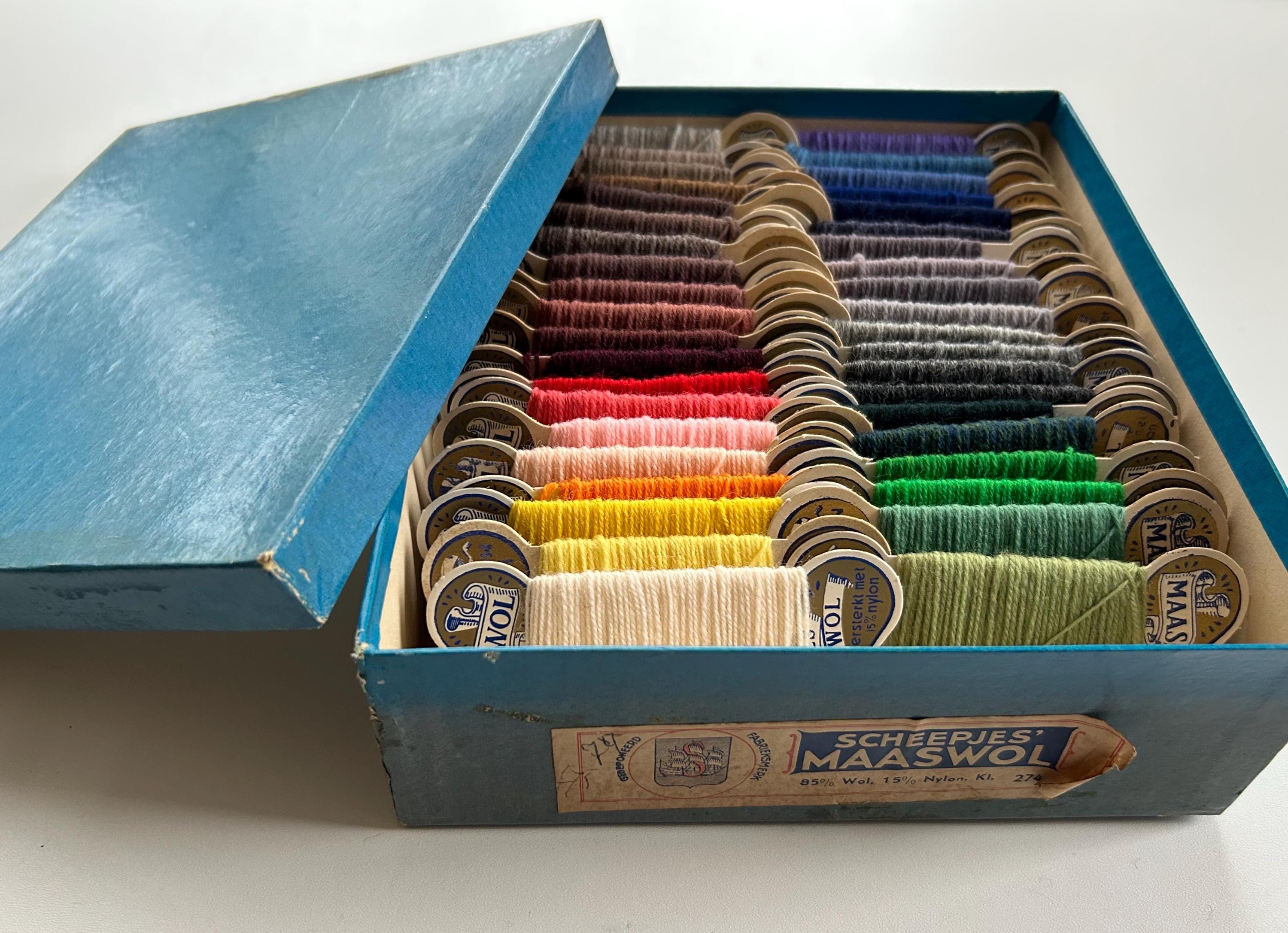 "'scheepjes maaswol' yarn gift BOX filled with 40 vintage multi coloured wool cards some time a...