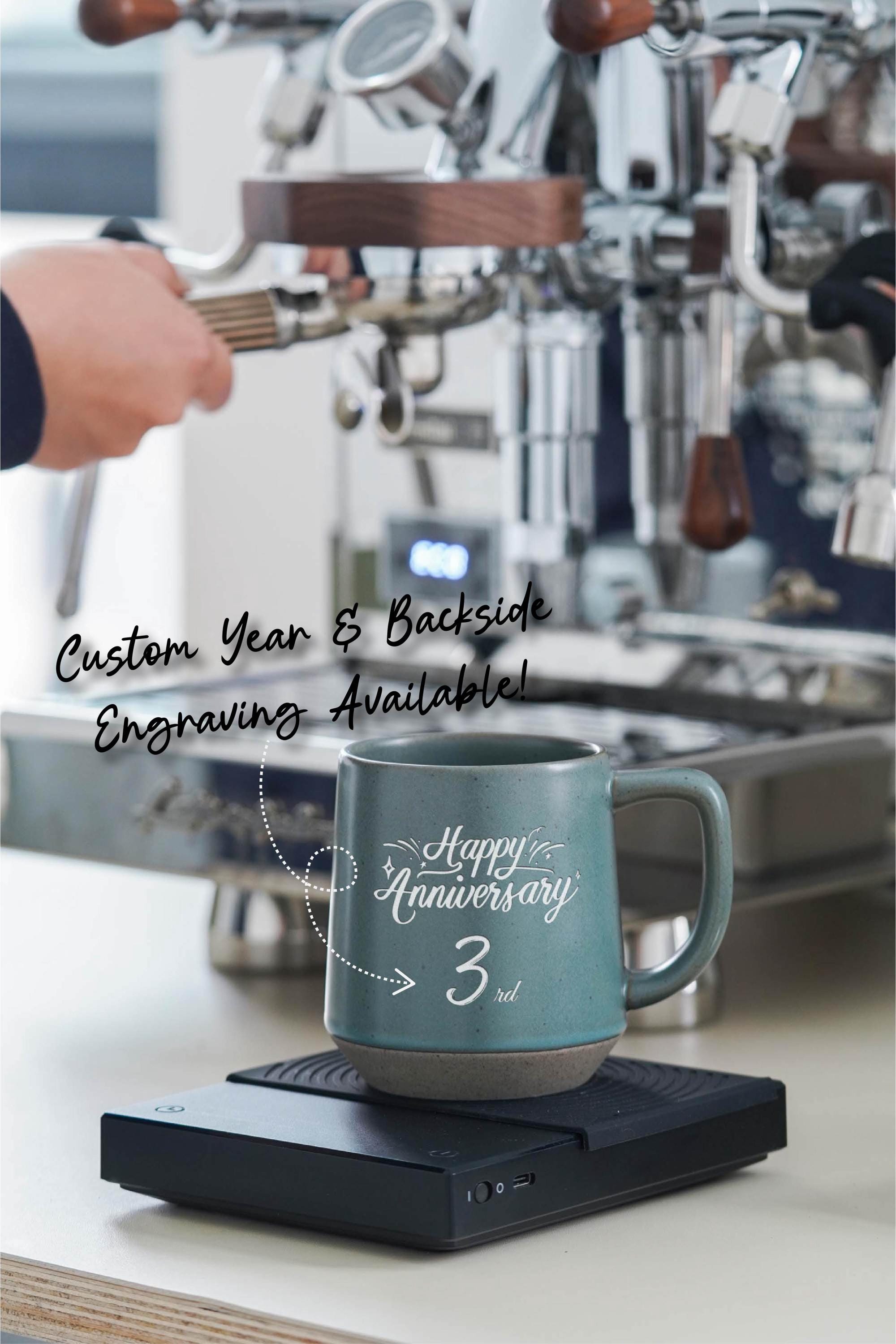 "Celebrate your special milestone with this engraved pottery mug, featuring a classic \"Ha...