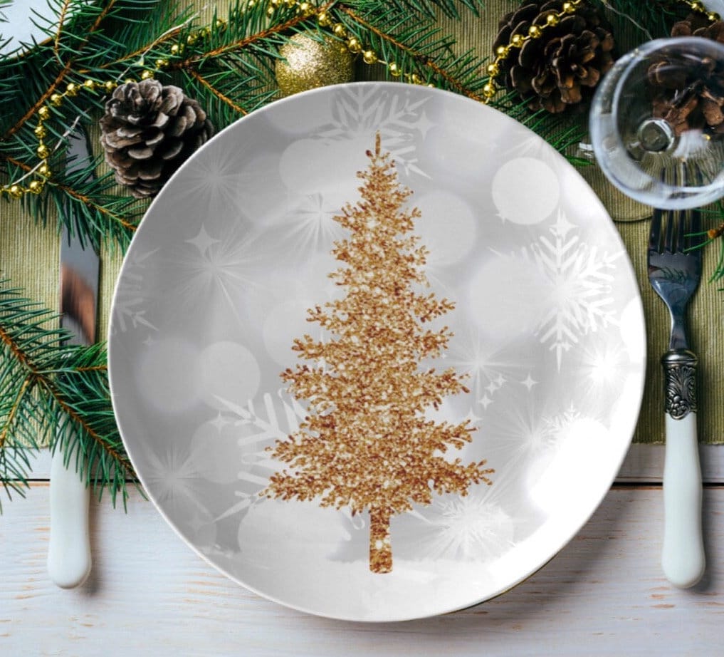 Christmas tree dinner plate, gold Christmas tree plate set, holiday...