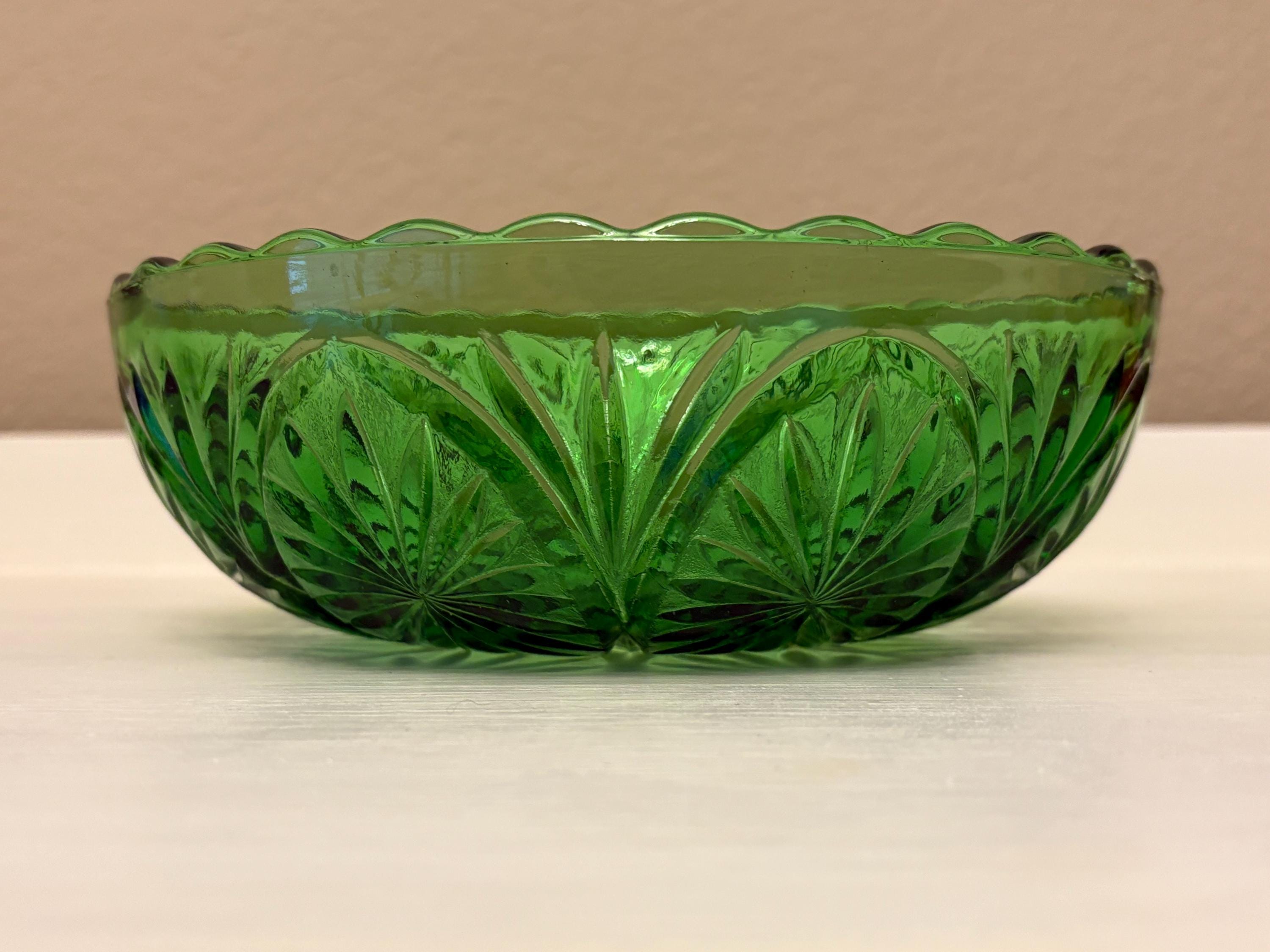 Antique Green Anchor Hocking Cut Glass Bowl, Starburst Pattern, ant...