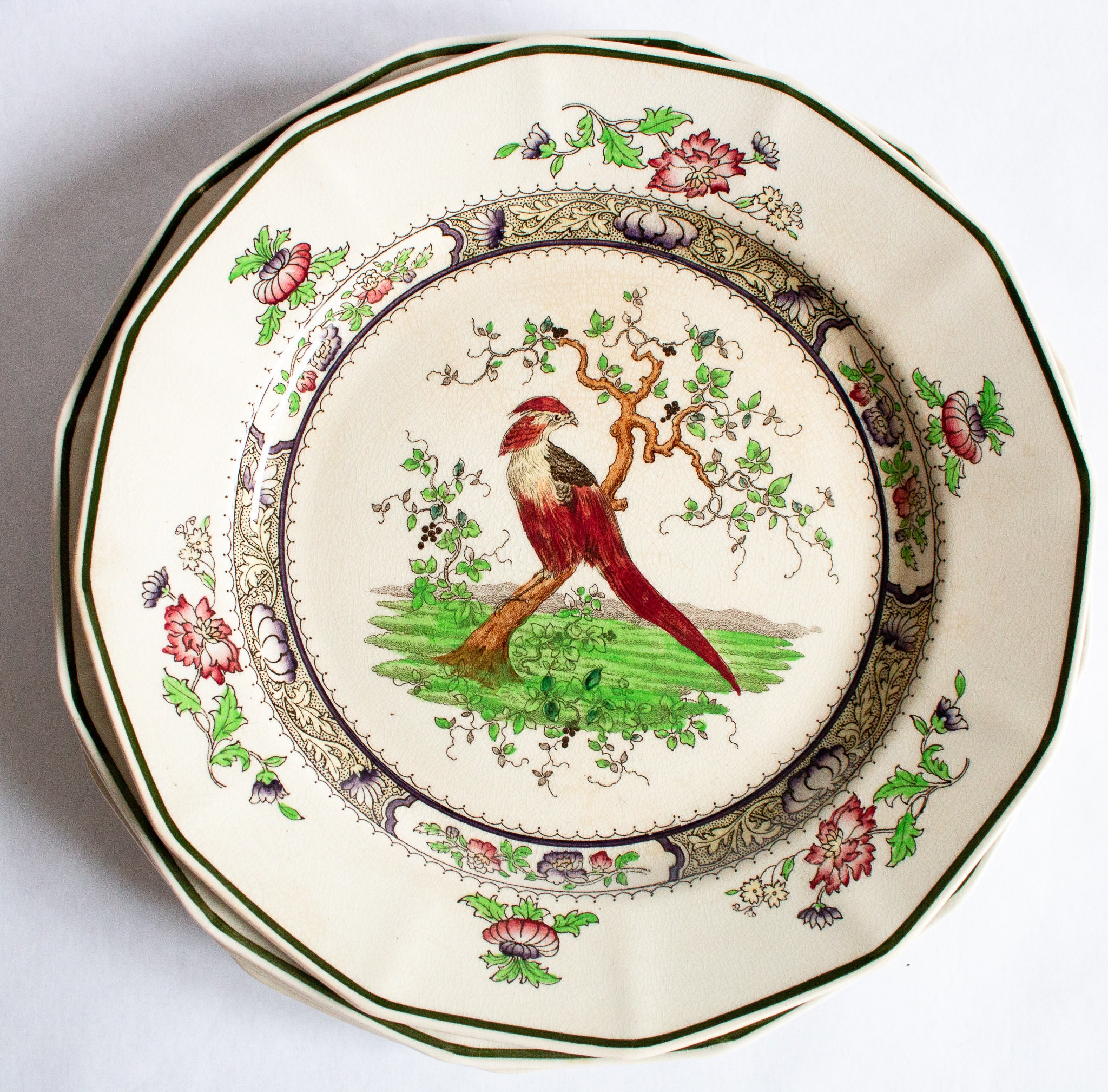 A set of four art deco era Royal Doulton 'Pekin' pattern dinner plates with exotic birds detail. In ...