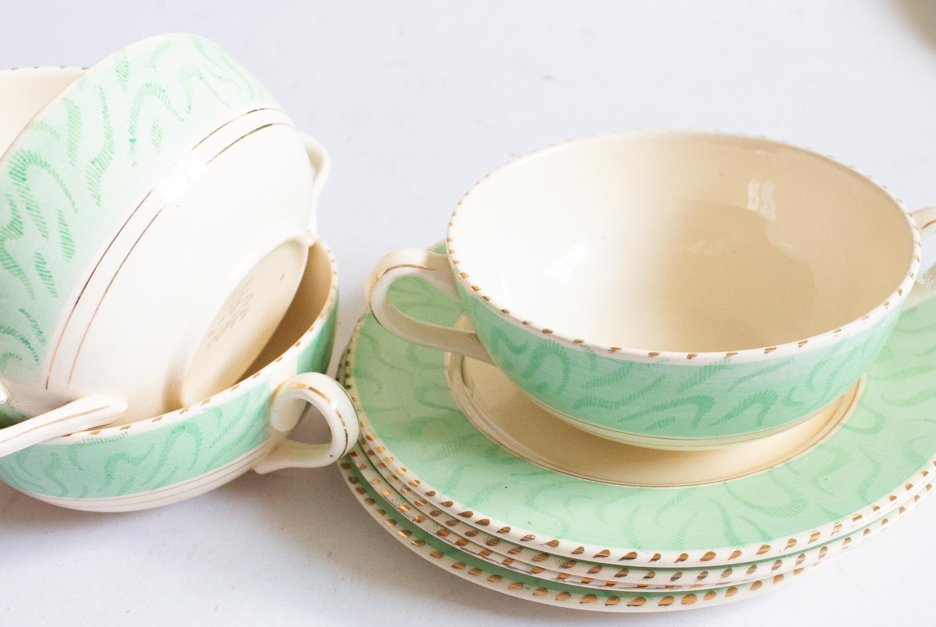 A set of four vintage art deco Burleigh Ware 'Balmoral' pattern twin handled soup bowls and plates. ...