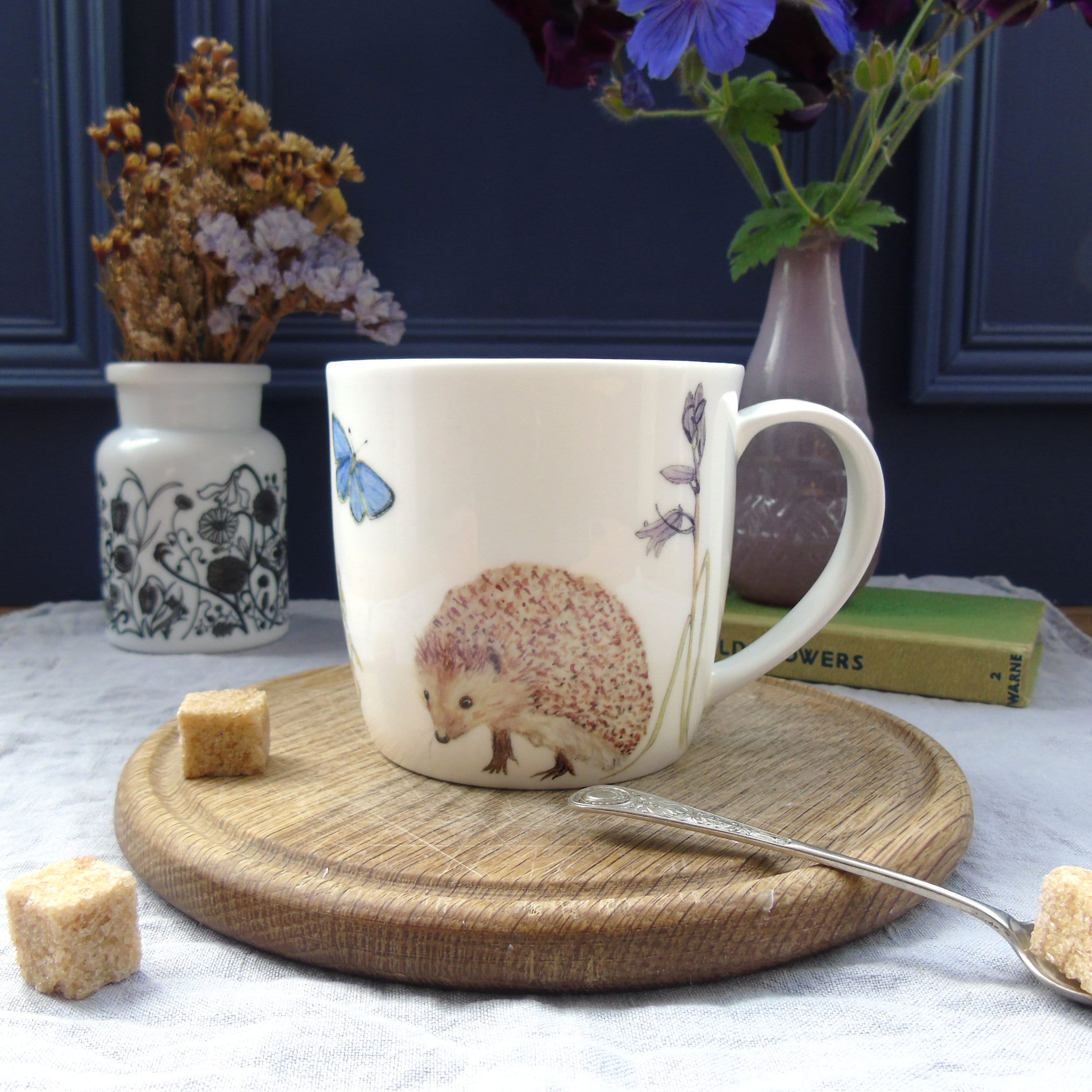 Bone china mug featuring my watercolour paintings of a cute hedgehog among woodland flowers. My illu...