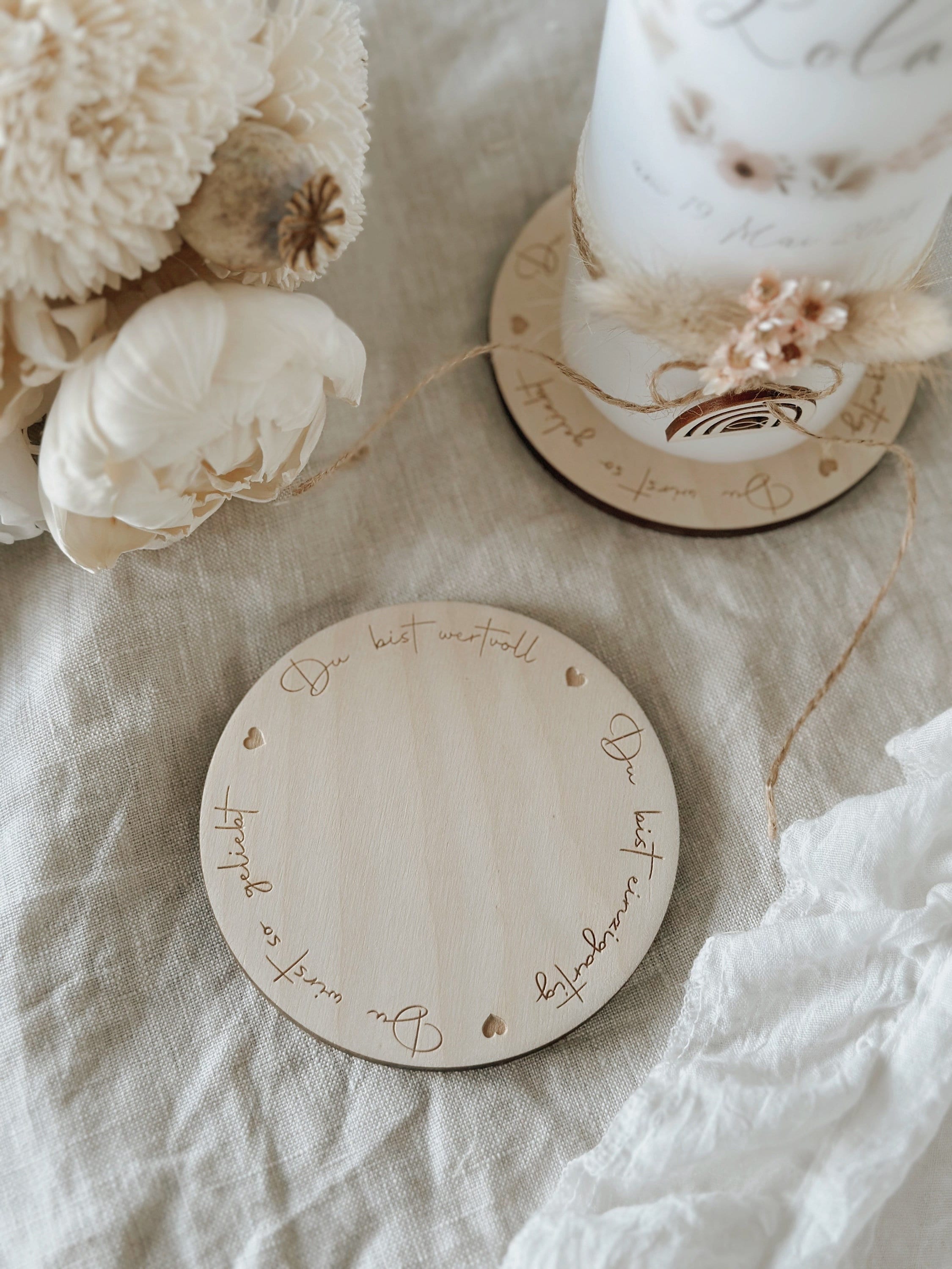 Adorable birchwood candle holder/plate with engraved affirmation (you are loved / you are valuable /...